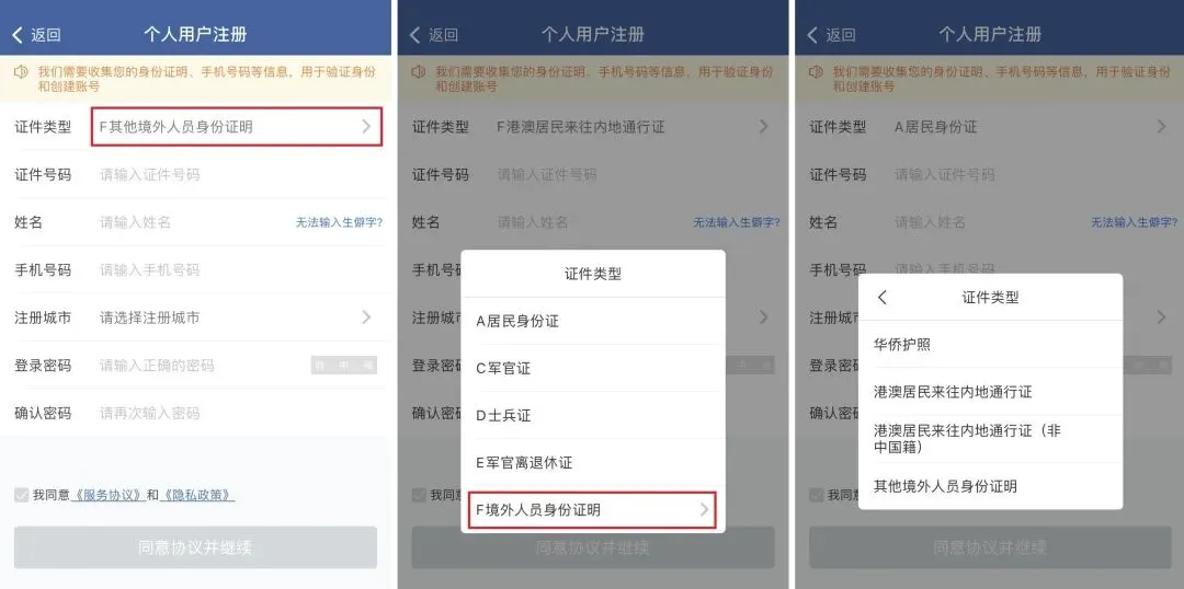 二、港澳居民注册时,“证件类型”栏请选择“F类境外人员身份证明”,并根据本人内地驾驶证号码一致的相应证件类型(港澳居民身份证、回乡证或护照),进一步选择对应的证件类型子项;“证件号码”栏请填写本人内地驾驶证号码。