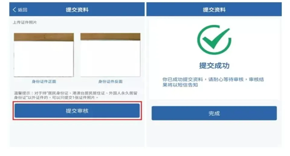 三、注册过程中,系统会要求上传证件照片进行人工审核,请按照提示拍摄上传。人工审核时间大约为1天,审核通过后将会发送成功注册短信通知。
