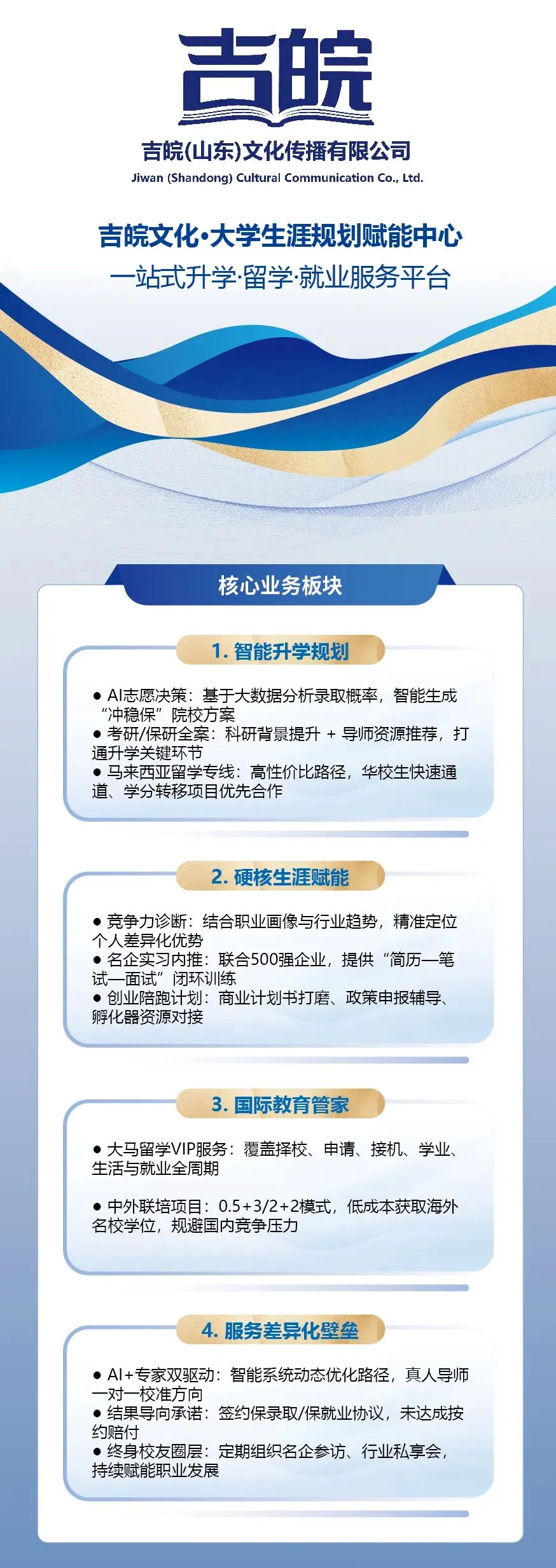 吉皖文化以“升学 + 生涯 + 国际”三维战略为核心,依托大数据AI规划系统与多领域导师智库,构建“规划引领 → 路径赋能 → 结果交付”的一站式成长平台,助力学子打破信息壁垒,提升核心竞争力,实现从名校升学到高质量就业,再到全球发展的无缝衔接。