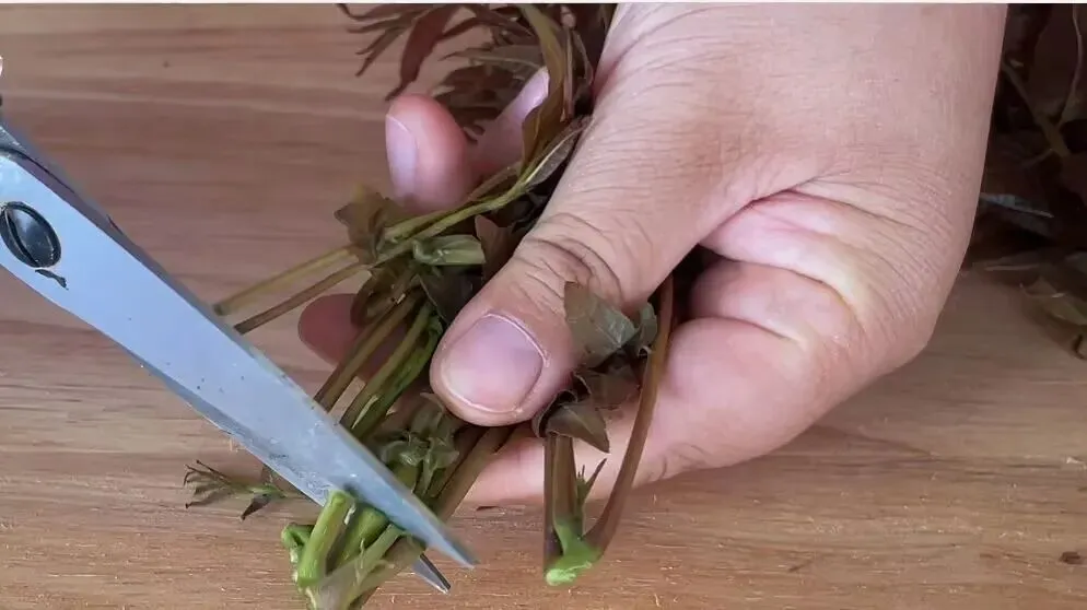2、先把香椿芽比较硬的根部,剪下来不要。