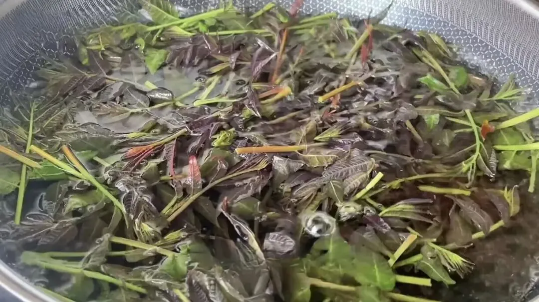 3、这一步不能省。水开放香椿焯水至变色,一是去掉所含草酸和亚硝酸盐,二是热水烫一下,香椿味更香浓。