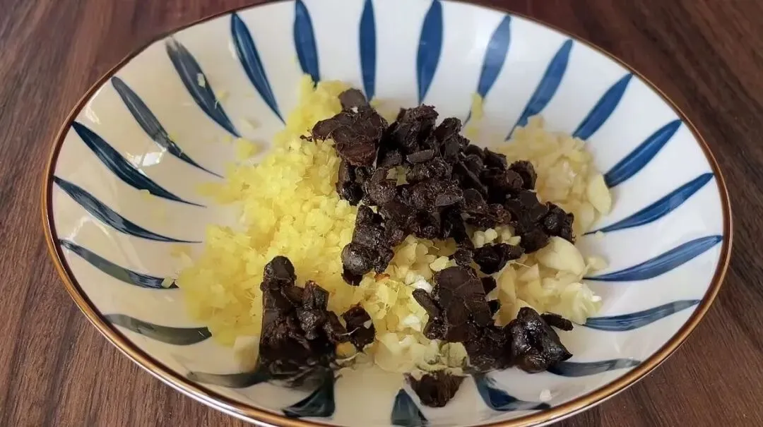 5、准备一头大蒜、一小块姜,分别切成蒜末、姜末,再准备一点豆豉,切几下放进来。