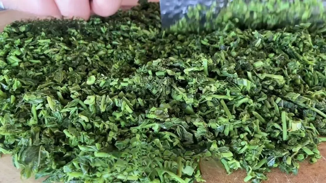 6、香椿也切碎。刀和案板,最好都不要有生水。