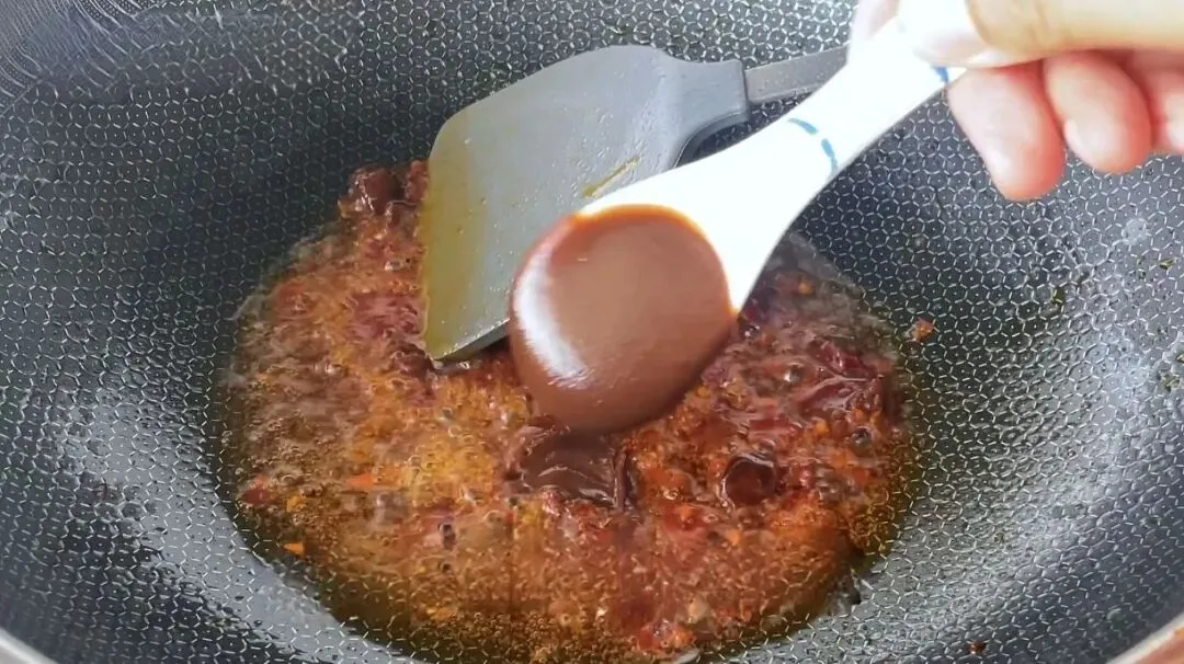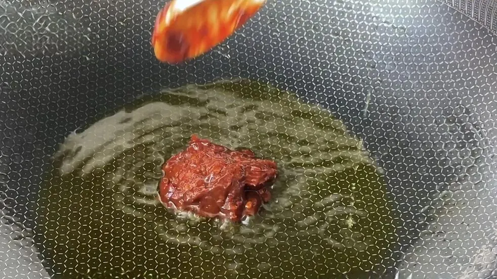 7、炒锅倒入适量无味道的葵花籽油,或者玉米油,豆油等。不要用香味浓郁的花生油和菜籽油,以免抢夺香椿味。油热后,先放入一勺红油豆瓣酱,最小火炒香。