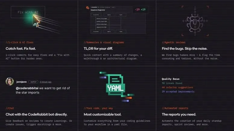 CodeRabbit 是一个 AI 审查器,直接接入 GitHub、GitLab 和 Bitbucket,也可以在 IDE 和 CLI 里使用。它读取完整的 PR,逐行留评论,生成摘要和架构图,还能在线程里回答问题。它还会随着时间适应:你对它评论的点赞或踩帮助它理解团队风格。用简单的 @coderabbitai 命令还能让它写测试、生成文档、开 issue。