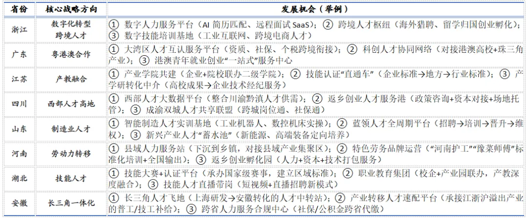 「服务端」:细分领域头部企业(如AI+HR、跨境猎聘、合规咨询、蓝领培训、职业背调、员工福利、行业论坛等)可借政策东风快速占领区域市场;