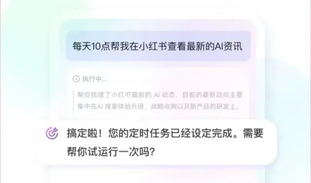 红手指Operator目前只支持安卓,iOS版本说是这个月内会上。用过之后你会发现,它本质上是一个能理解模糊表达,然后拆解成具体步骤去执行的中间人。比如你让它“每天10点帮我在小红书看看最新的AI资讯”,它就会把这个设成定时任务,到点自己跑去翻内容。