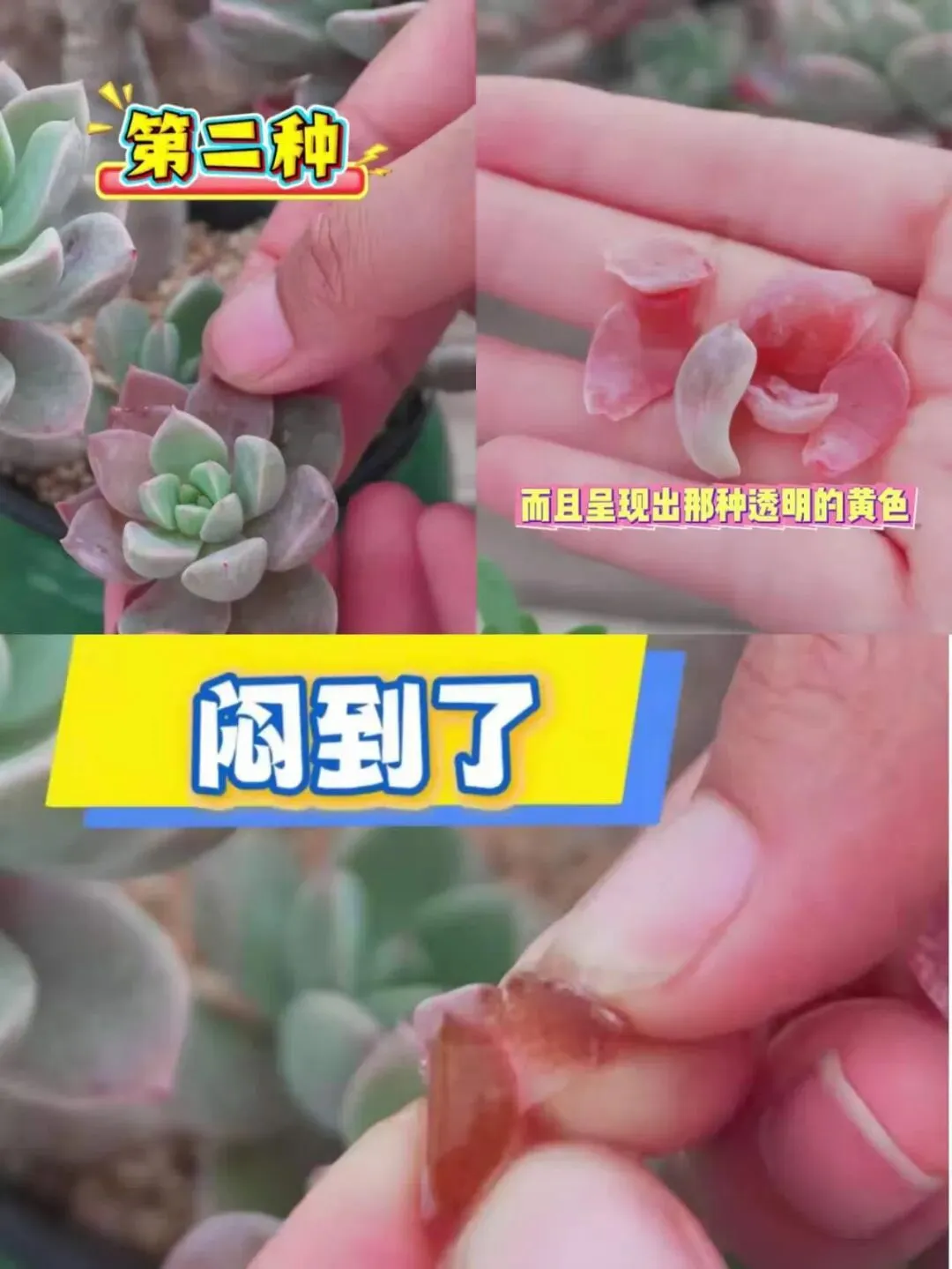 第二种,就是如果你发现下层的叶片,开始整片整片的脱落,而且呈现出那种透明的黄色,掐一掐呢还有水分,那就说明啊,咱们的环境啊,属于不通风的一个情况,也就是说咱们的多肉植物啊,透不过气,闷到了。