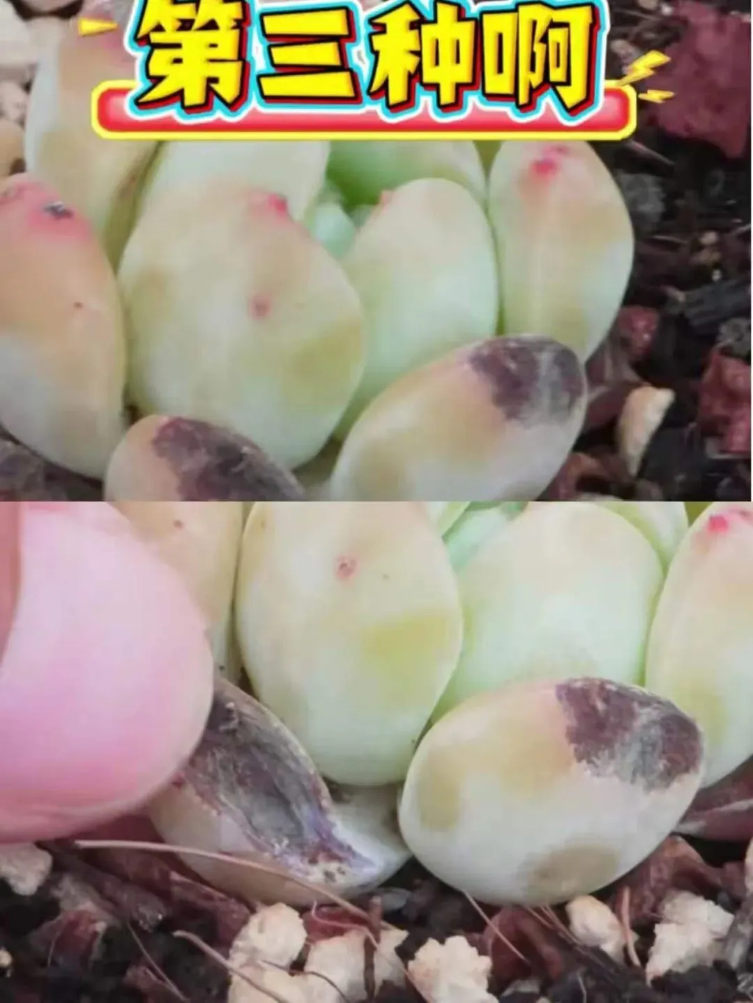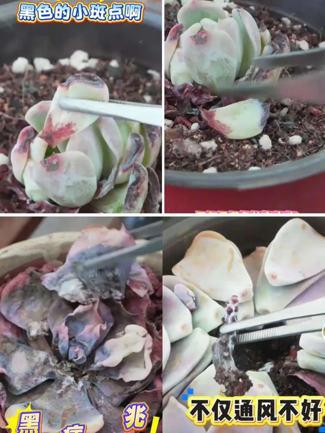 第三种,就是如果发现下层的叶片啊,不仅出现了这种掉落,而且呢还有这种黑色的黑点,那就说明啊,咱们的水浇多了,多肉可能出现这种黑腐的情况,而这也是多肉植物常见的一款病,黑腐病的前兆。