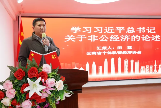 云南省个体私营经济协会党支部书记田猛,领学了习近平总书记关于非公经济的重要论述,着重解析了“两个毫不动摇”、“三个没有变”、“两个健康”的深刻含义。
