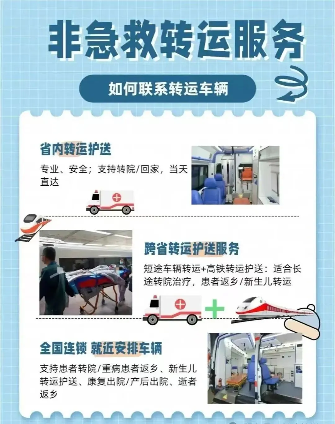 服务覆盖全场景:重症跨省转运、市内及跨省长短途转院、复查、返乡,新生儿恒温转运、骨科及行动不便者专业转运,同时承接遗体转运、活动医疗保障,提供床到床无缝衔接服务。