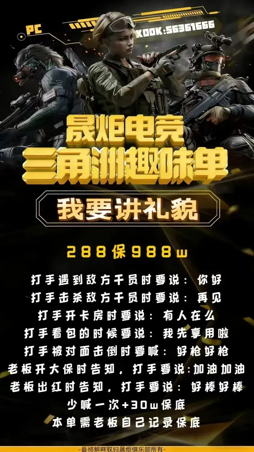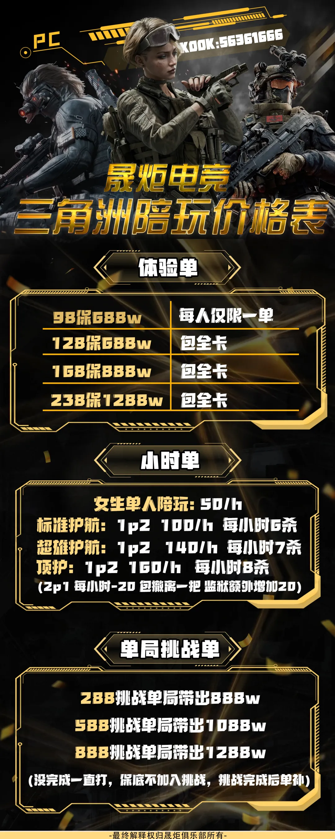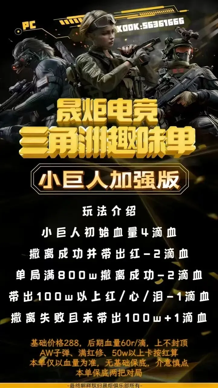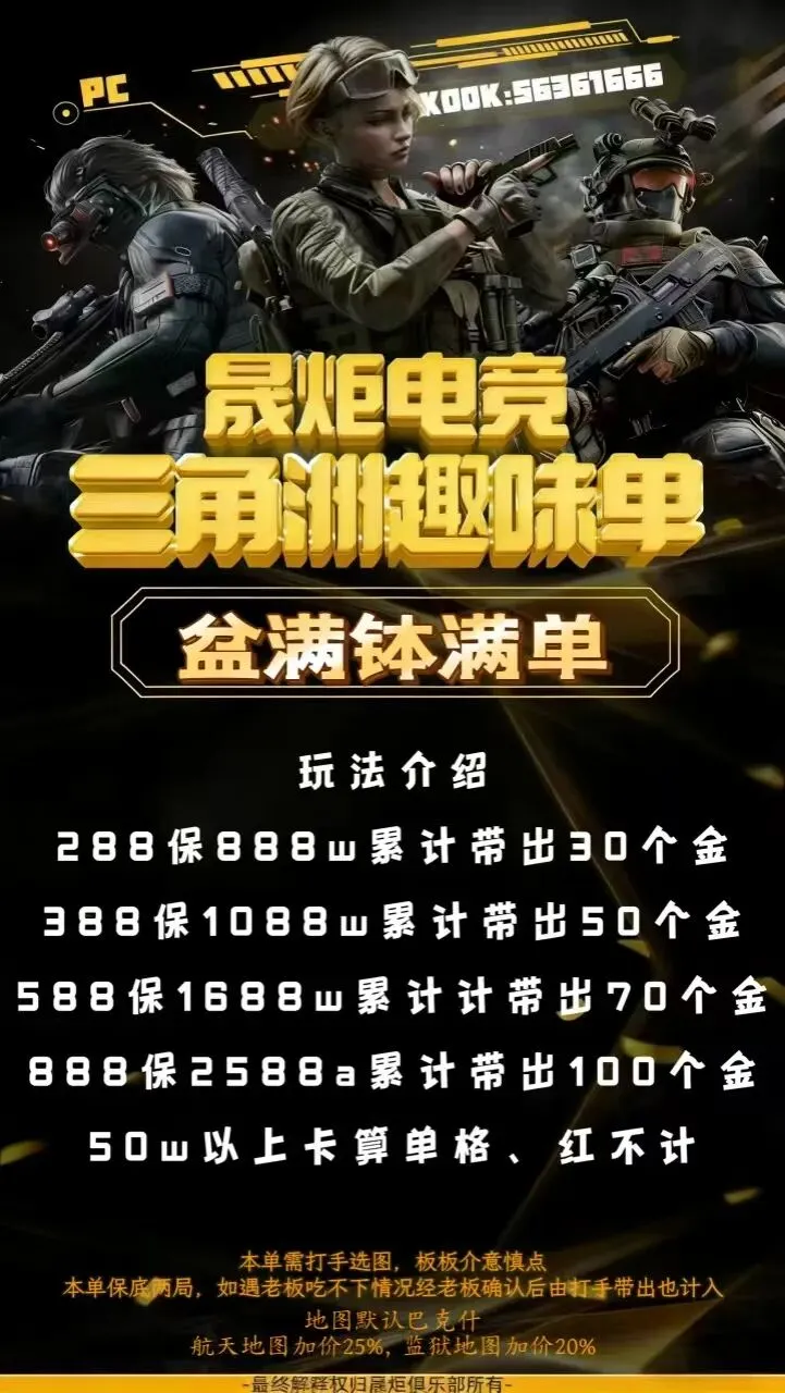【晟炬电竞】三角洲价格表合集 板板下单前请先阅读下单须知 注:板板在游戏过程中有任何问题及感受不佳的情况,请及时跟客服反馈处理或换人,本店不接受板板在结单后,以游戏过程中体验不佳等理由要求退全款,敬请谅解。 体验单 趣味单(包全卡) 基础保底单(包全卡) 美美得吃单(包全卡) 护航猛攻单(包全卡)