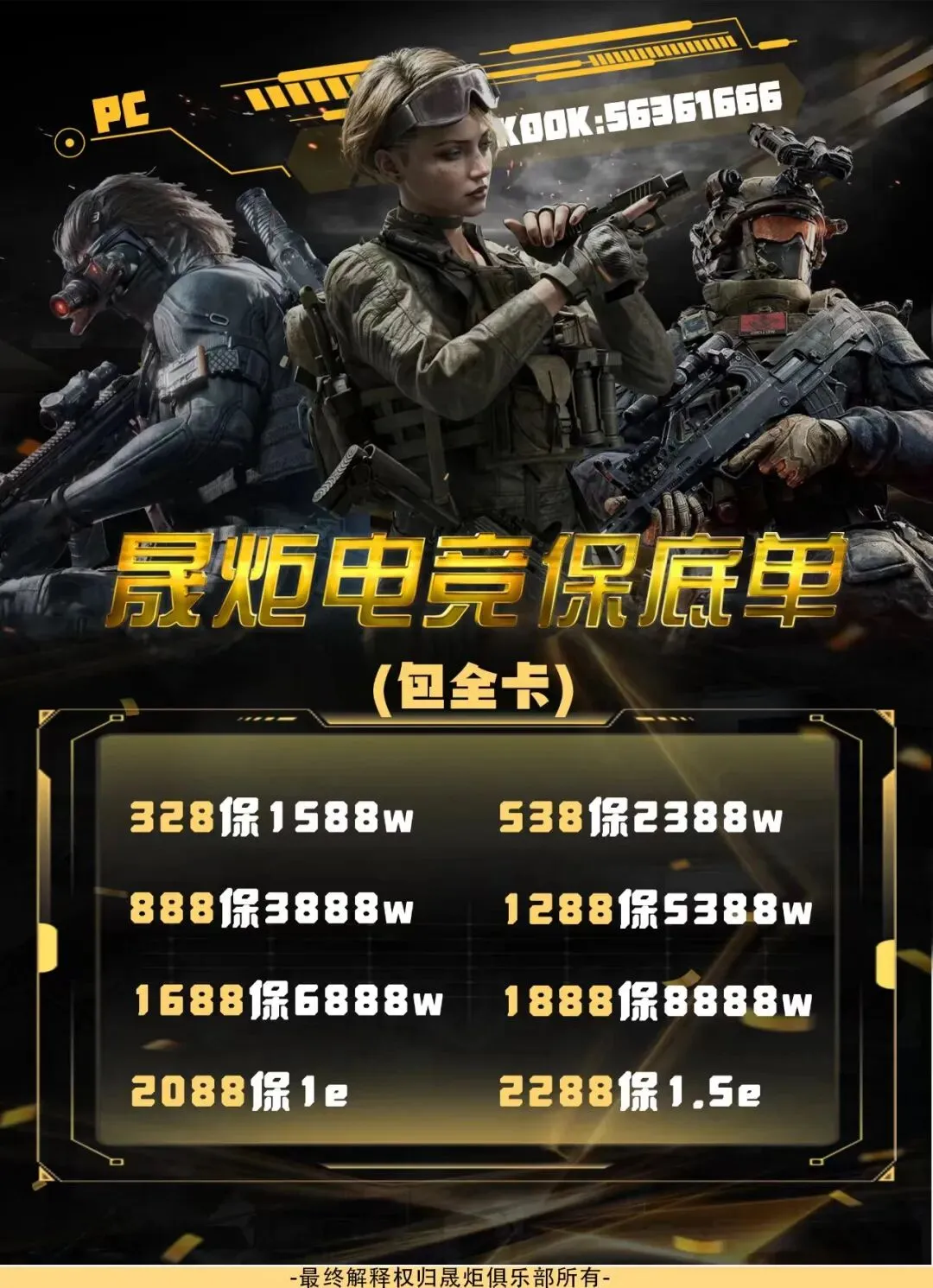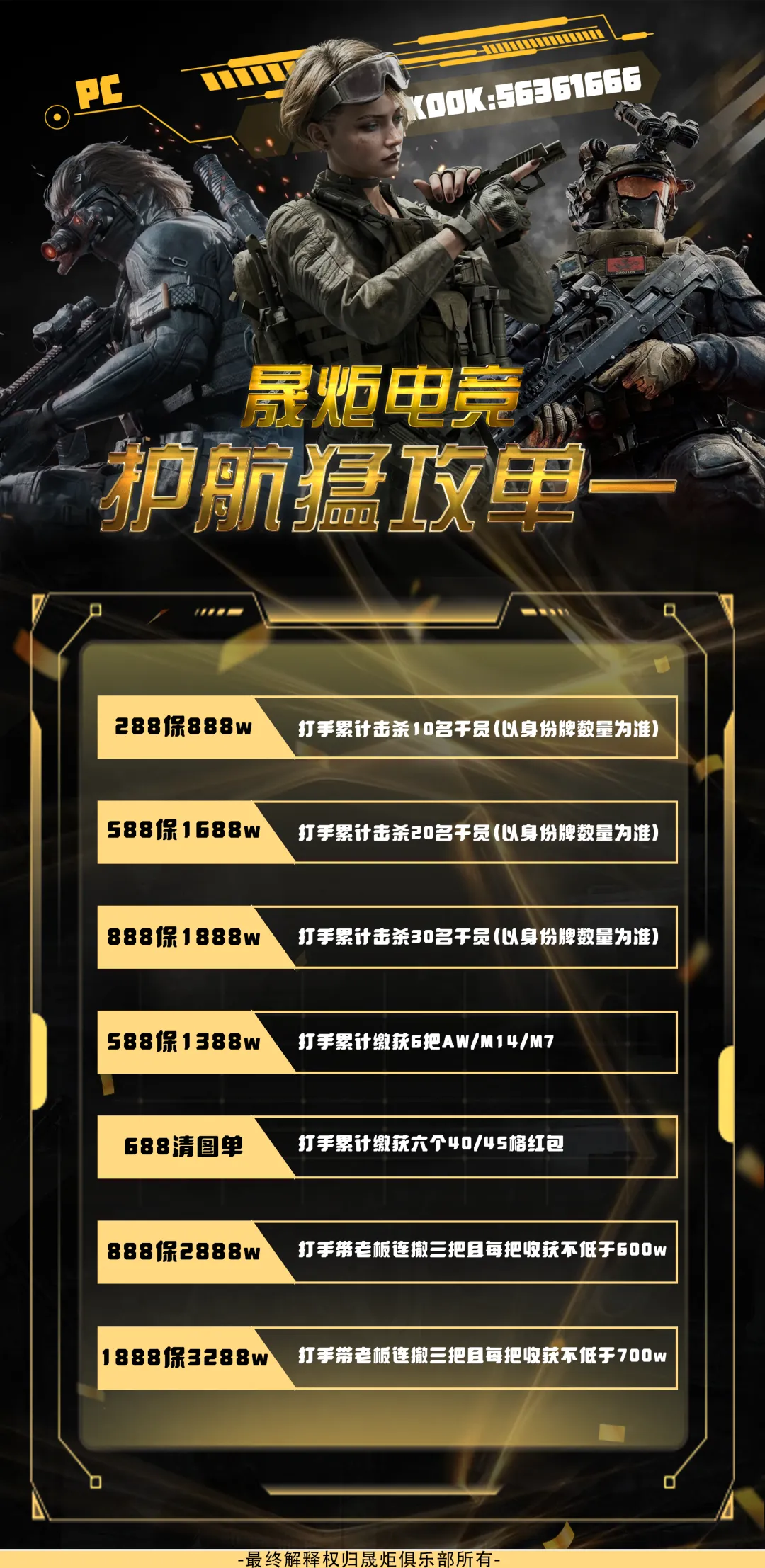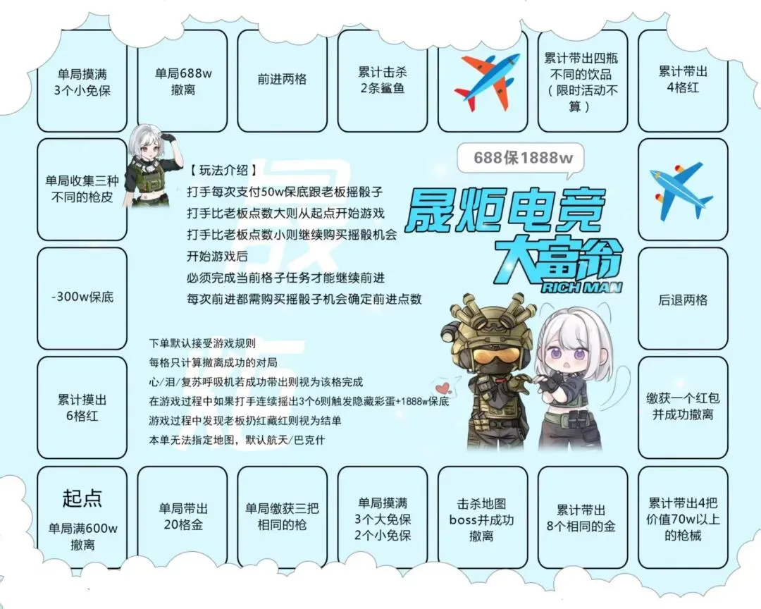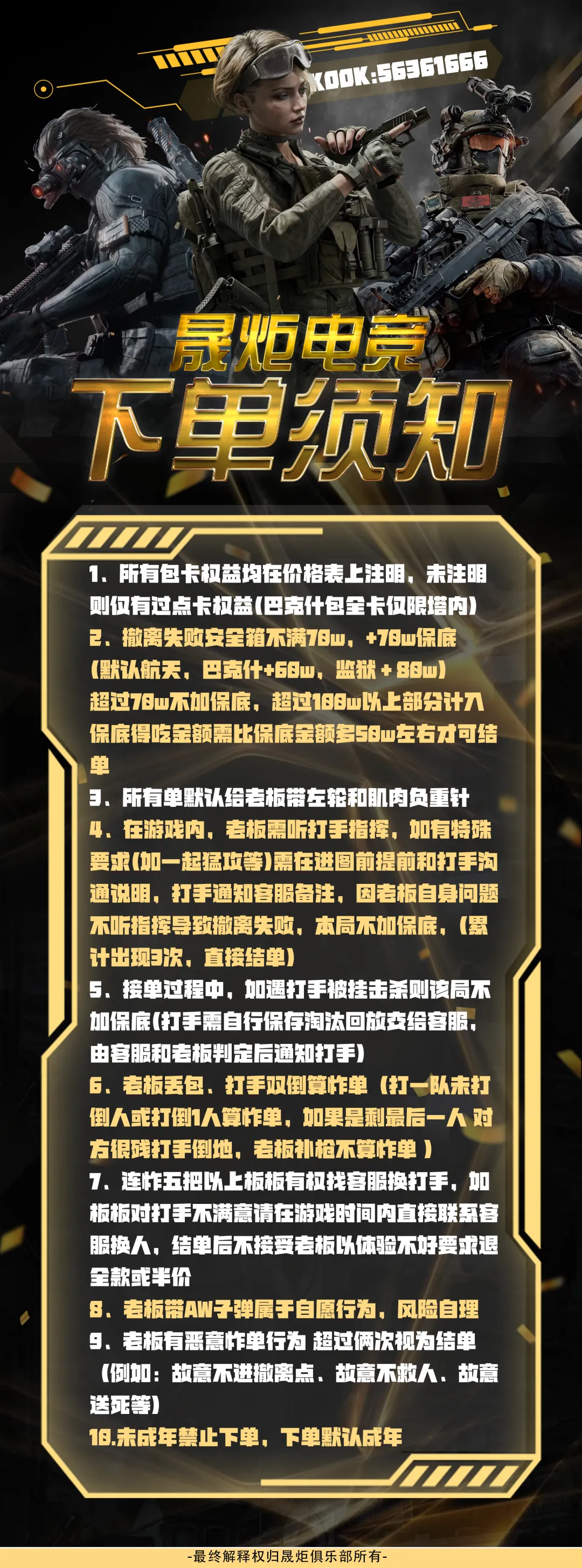 【晟炬电竞】三角洲价格表合集 板板下单前请先阅读下单须知 注:板板在游戏过程中有任何问题及感受不佳的情况,请及时跟客服反馈处理或换人,本店不接受板板在结单后,以游戏过程中体验不佳等理由要求退全款,敬请谅解。 体验单 趣味单(包全卡) 基础保底单(包全卡) 美美得吃单(包全卡) 护航猛攻单(包全卡)