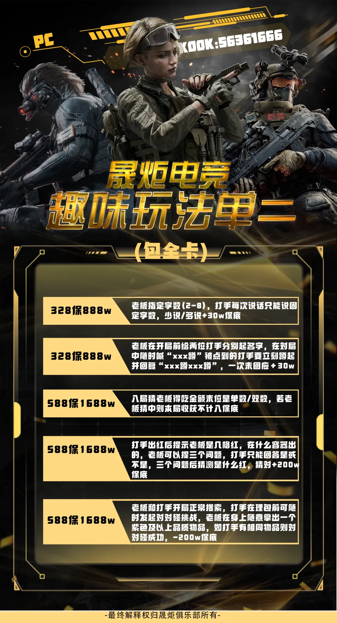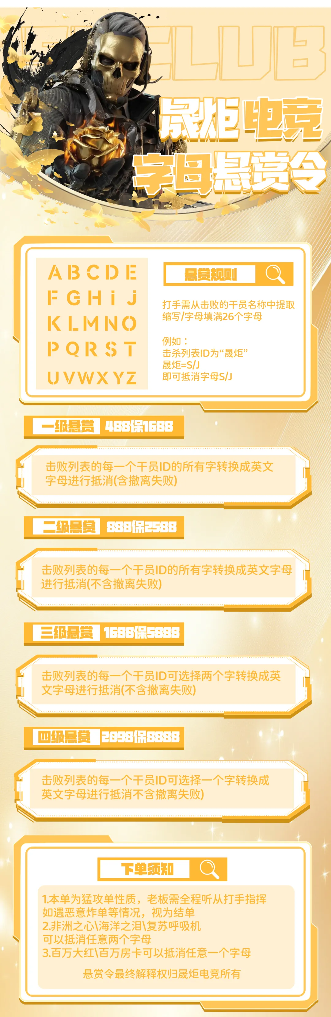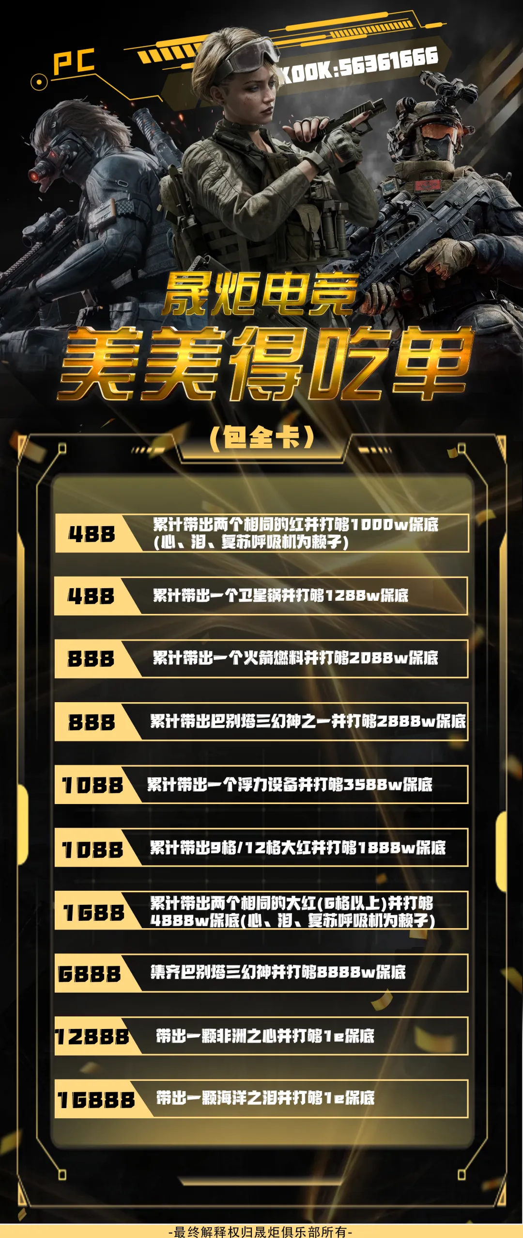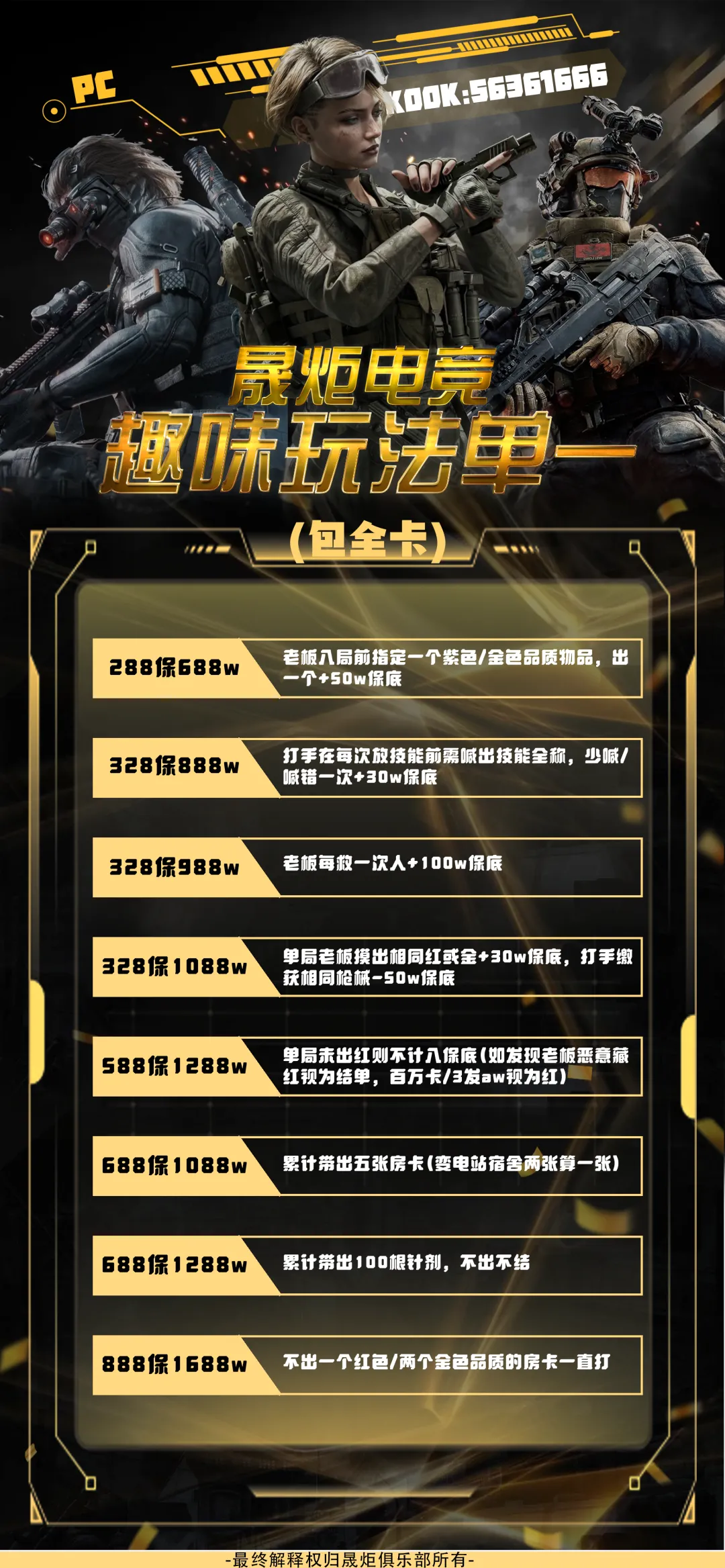 【晟炬电竞】三角洲价格表合集 板板下单前请先阅读下单须知 注:板板在游戏过程中有任何问题及感受不佳的情况,请及时跟客服反馈处理或换人,本店不接受板板在结单后,以游戏过程中体验不佳等理由要求退全款,敬请谅解。 体验单 趣味单(包全卡) 基础保底单(包全卡) 美美得吃单(包全卡) 护航猛攻单(包全卡)