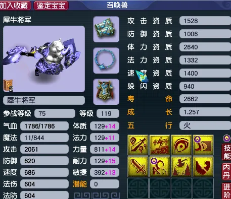 犀牛将军是75级就能参战的,自然并不会成为很多109级的主力宝宝。它其实归宿是89级勇武的宝宝。但是这只却被升级到119级,因为它它技能可是格外华丽的,8个全红的技能里面,包含着出其不意和力劈华山。这样面对一些高防御的单位,一样是能打得进去。