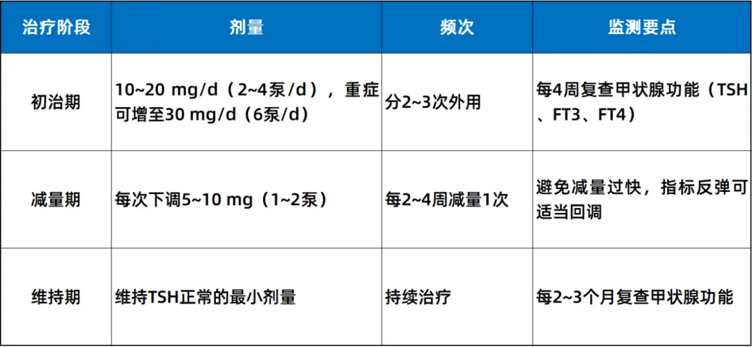 停药指征:小剂量维持(如隔天5mg)、甲状腺功能完全正常、TRAb转阴、维持期疗程足够时,可考虑停药。