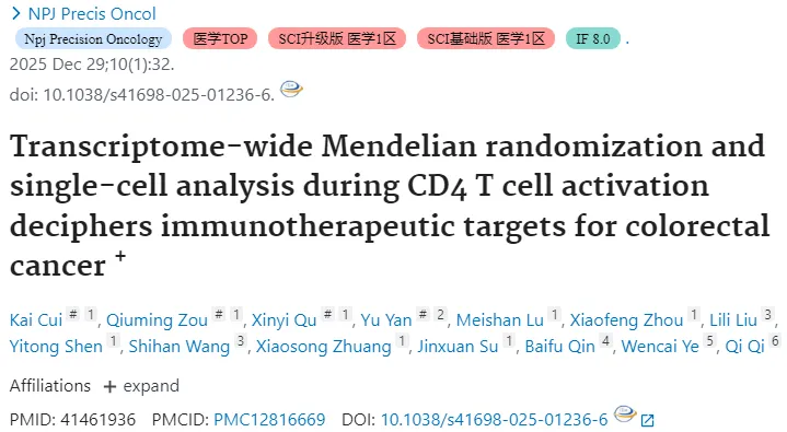 标题:CD4+ T细胞活化过程中的全转录组孟德尔随机化和单细胞分析揭示了结直肠癌的免疫治疗靶点