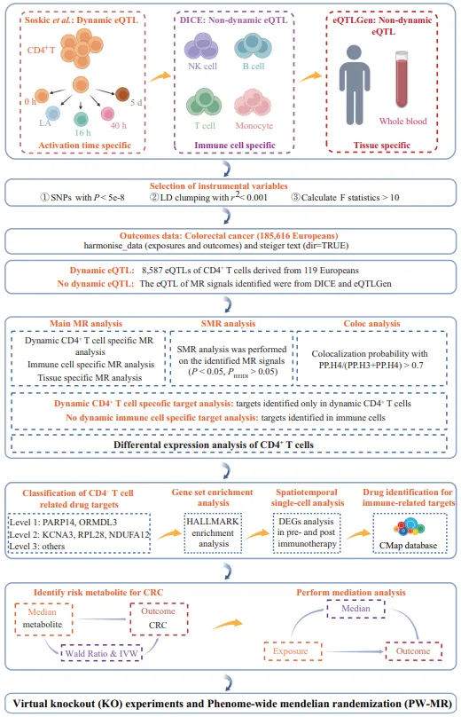旨在通过孟德尔随机化和单细胞RNA测序,探索CD4+ T细胞活化相关基因与结直肠癌的因果关系,以识别潜在的免疫治疗新靶点。