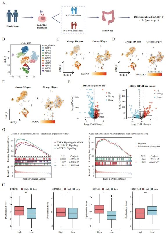 免疫治疗前后的单细胞测序数据显示,在疾病稳定患者中,ORMDL3、PARP14和KCNA3等靶点表达显著上调,而在治疗应答良好的患者中,PARP14表达显著下降,揭示了这些基因与免疫治疗耐药性的关联(表2)。