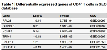 表1.GEO数据库中CD4+ T细胞的差异表达基因