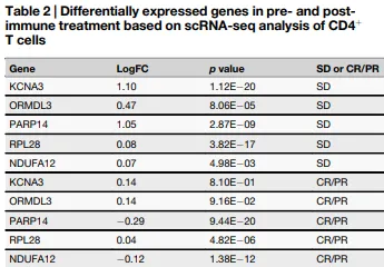 表2.基于CD4+ T细胞的单细胞RNA测序分析,免疫治疗前后的差异表达基因