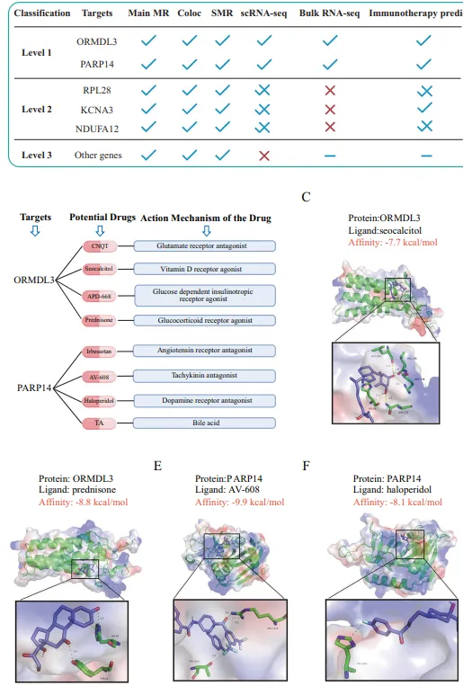 通过CMap数据库筛选发现,针对关键靶点ORMDL3和PARP14,共识别出16种具有潜在治疗作用的化合物,其中8种药物与靶点表现出强结合力,为药物再利用提供了候选方向(表3)。