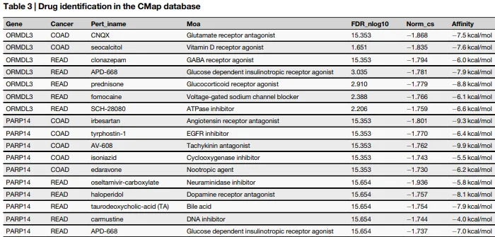 图4.针对结直肠癌中ORMDL3和PARP14的潜在治疗药物