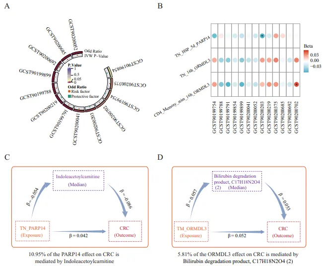 PARP14通过代谢物吲哚乙酰肉碱介导了10.95%的结直肠癌风险,而ORMDL3则通过胆红素降解产物C17H18N2O4(2)介导了5.81%的风险(图5)。
