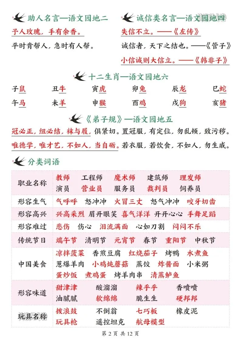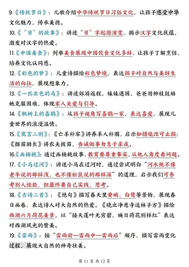 26年春人教新版二年级下册语文全册必备知识点汇总,共12页,电子版可打印可下载