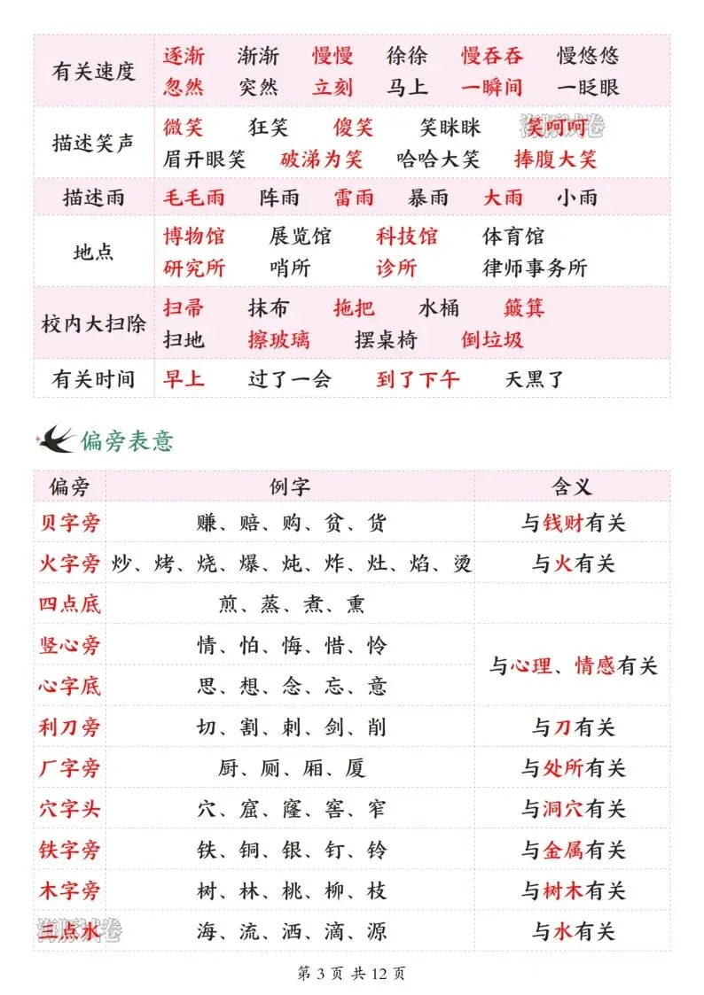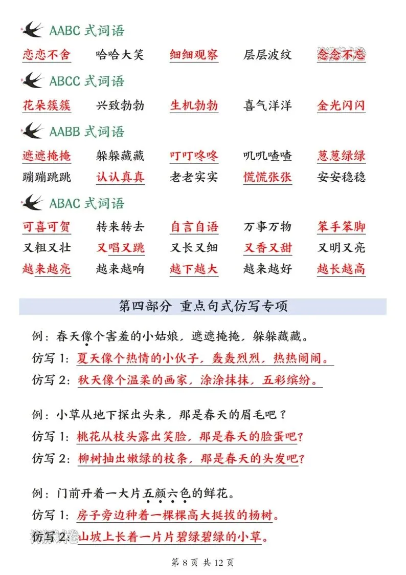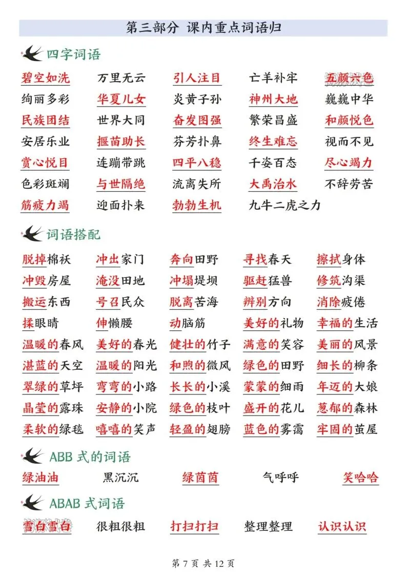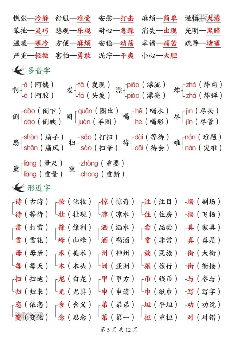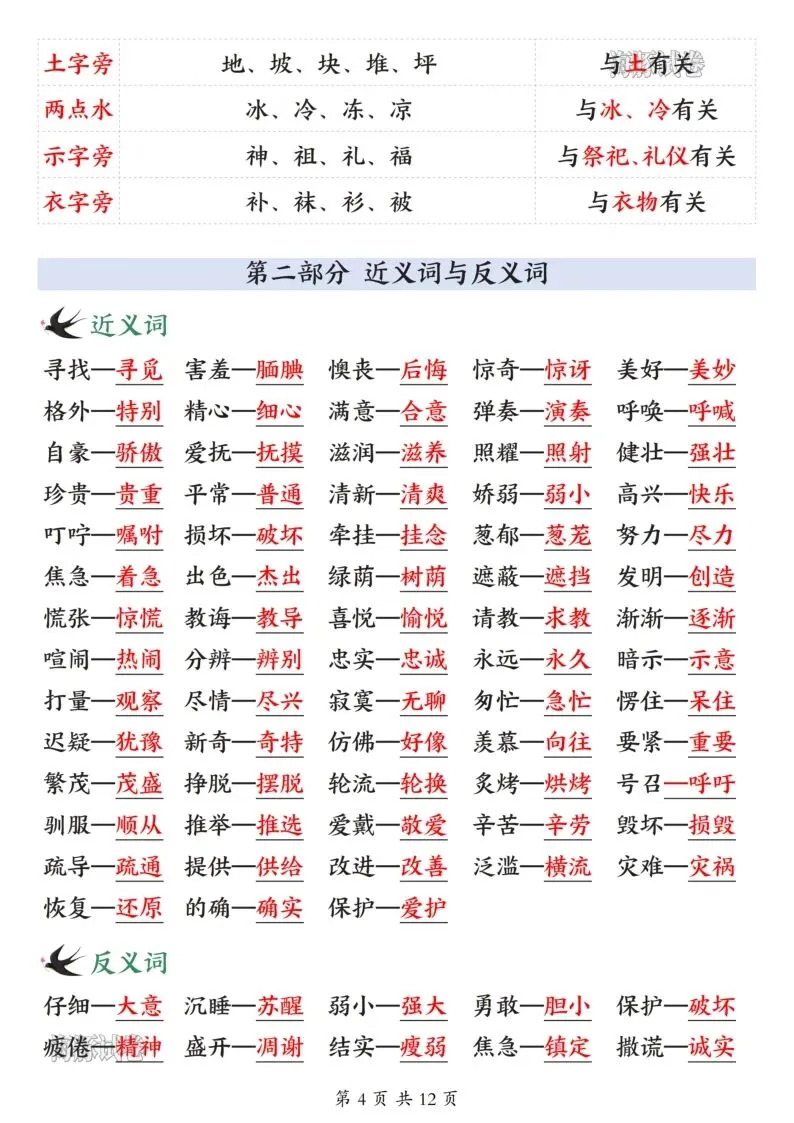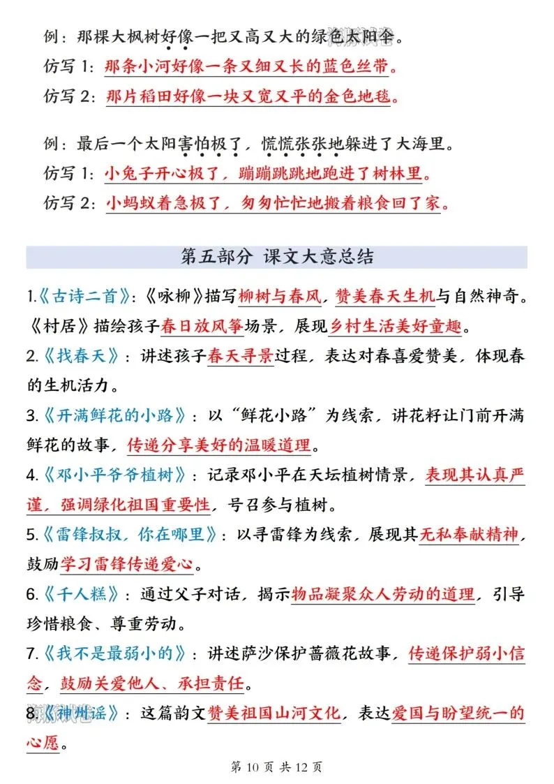 26年春人教新版二年级下册语文全册必备知识点汇总,共12页,电子版可打印可下载,这份二下语文全册必备知识点,包含了古诗与日积月累、近反义词、重点词语归纳、重点句式仿写、课文大意总结等内容,帮助孩子全方面梳理所学知识点,提升语文学习效率。需要的家长抓紧打印出来,让孩子背一背吧。