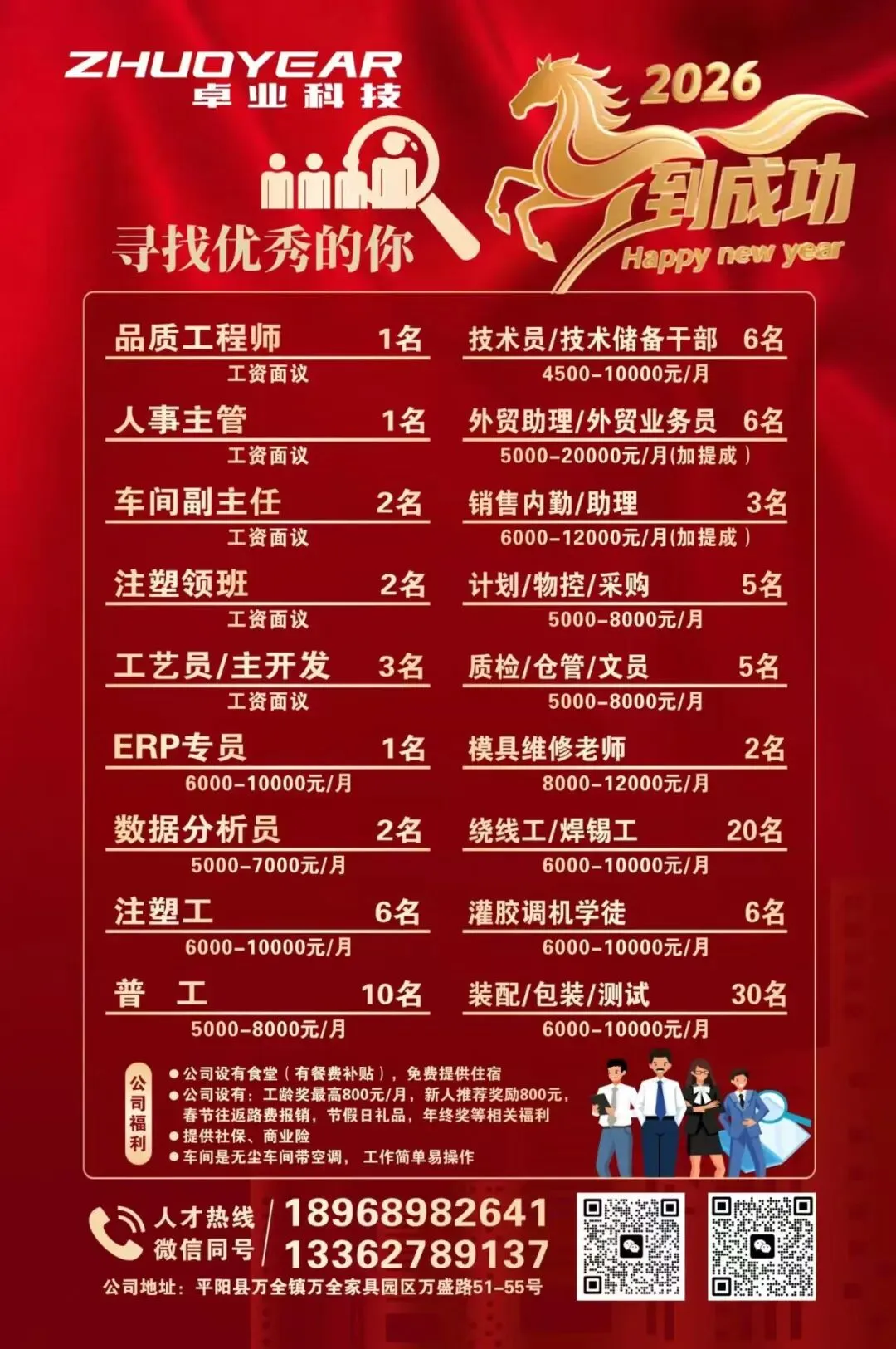 福利:五险、免费提供住宿、餐补5元/餐、春节往返车票报销、高温补贴、节日礼品、荐才奖1000元/人、生日蛋糕、特岗补贴300-500元/月、夜班补贴500元/月。