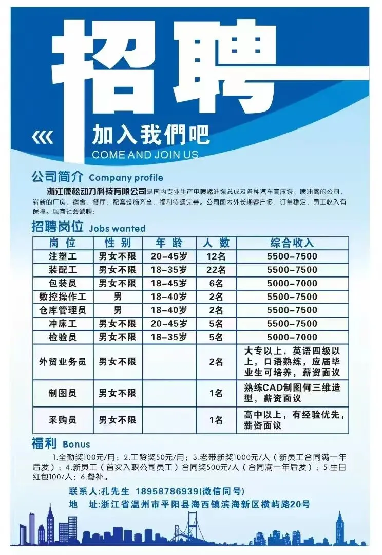 📣【温州博精塑料模具有限公司(吹膜机模具制造)】✨福利:试用期过后有社保,有宿舍,每个月单休,全勤奖等!