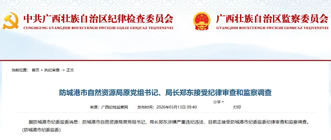防城港市自然资源局原党组书记、局长郑东接受纪律审查和监察调查 据防城港市纪委监委消息:防城港市自然资源局原党组书记、局长郑东涉嫌严重违纪违法,目前正接受防城港市纪委监委纪律审查和监察调查。 来源:广西纪检监察网 (版权归原作者所有,如有侵权请联系删除)