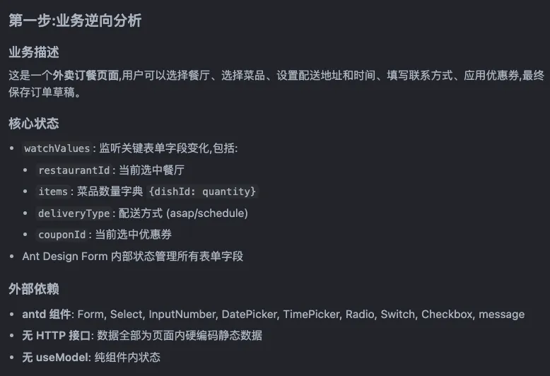 按照上面的提示词首先基于第一步生成了“业务逆向分析”,把对应的业务描述、核心状态、外部依赖这些生成,如下图所示: