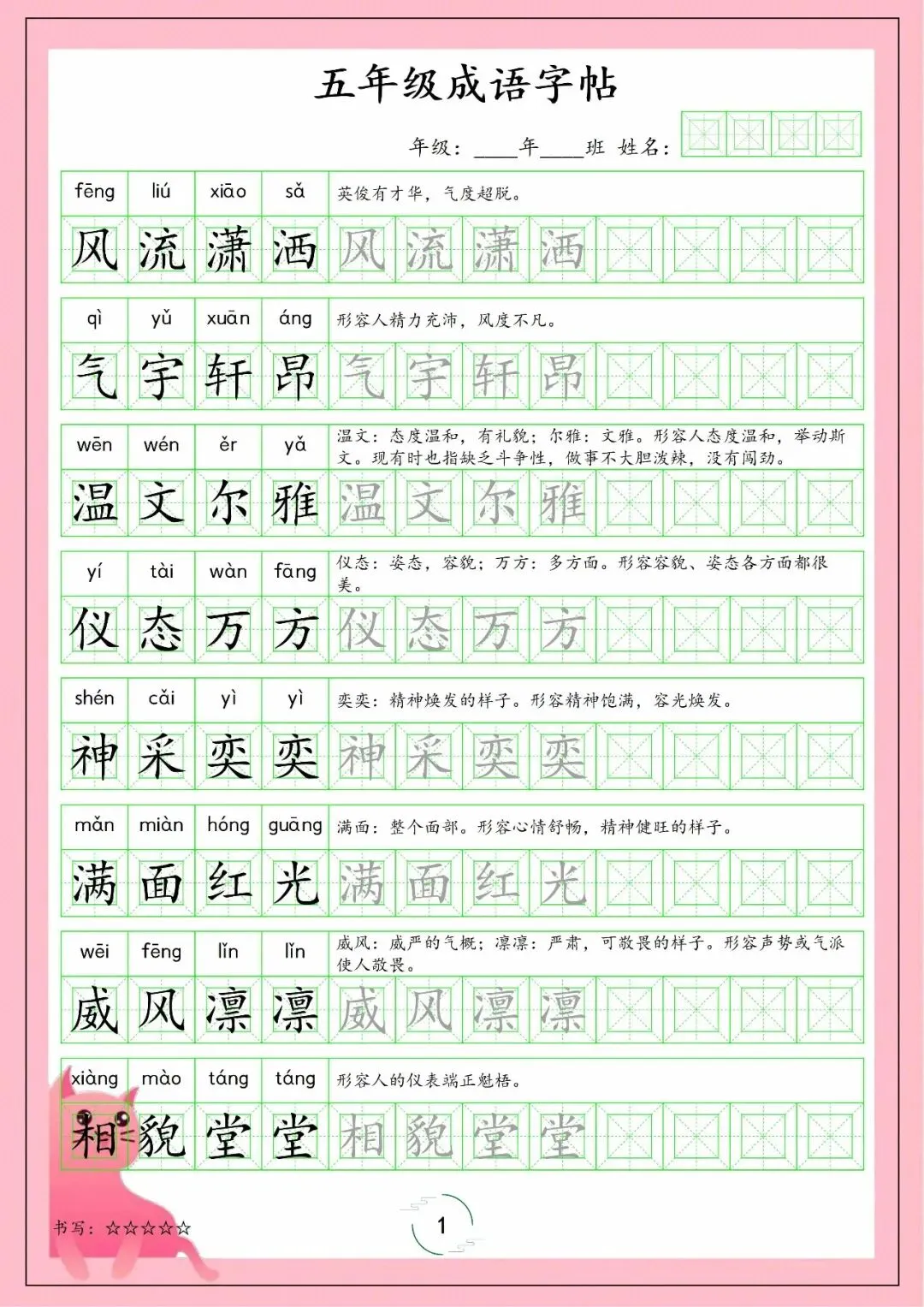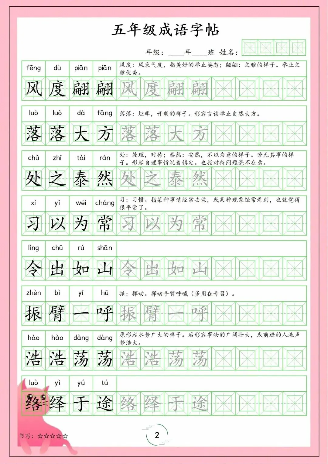 【免费下载】五年级下语文成语字帖,PDF电子版,共6页,可打印