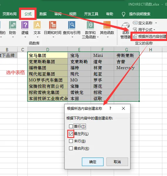 1、选中表格,【公式】-定义的名称组-根据所选内容创建,选择最左行为内容创建名称。