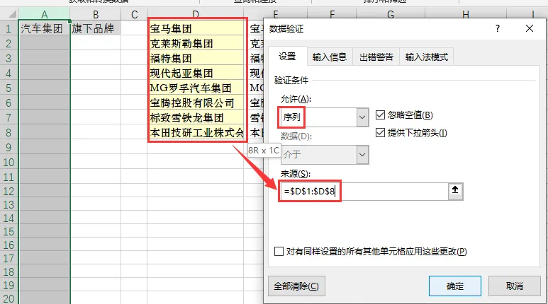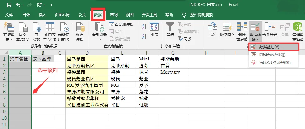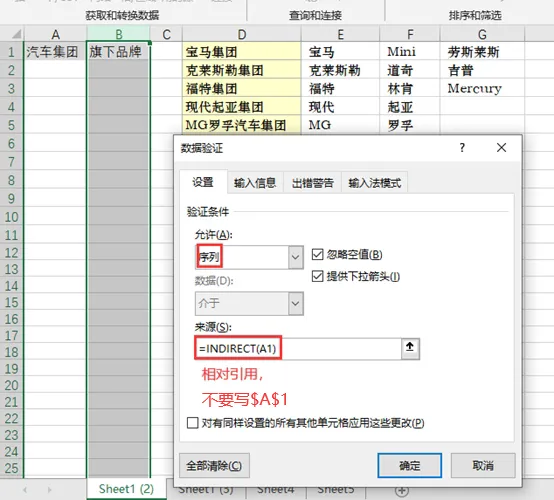 3、选中B列,同第2步一样选择数据验证,选择序列,接下来要用到发挥重要作用的函数,在来源输入公式=INDIRECT(A1),注意这里是相对引用,不要用$.