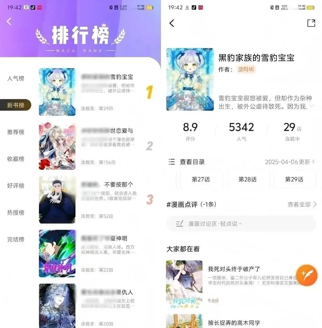 拷贝漫画,大家都熟知的漫画app了,无需V1P,老版本失效了,现在是复活版,软件UI界面跟以前的喵妃一模一样,包含的资源非常多,🀄️日韩漫画更新都是实时的,切换男频女频非常丝滑,韩漫的汉化非常到位。
