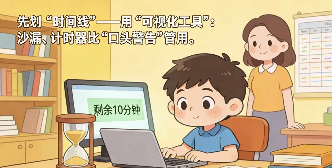 1. 用“可视化工具”:沙漏、计时器比“口头警告”管用,孩子看着沙子漏,就知道“时间在走