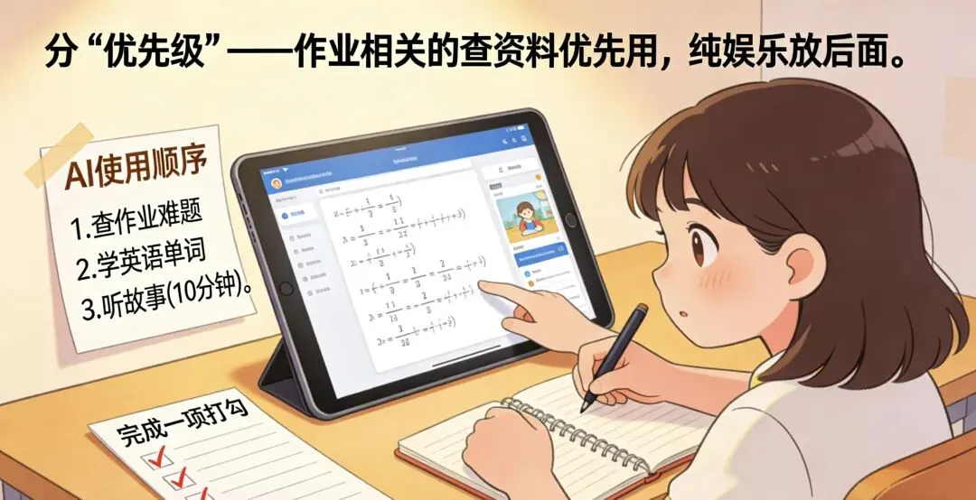 2. 分“优先级”:作业相关的查资料优先用,纯娱乐(听故事、聊天)放后面,让他知道“工具是帮学习的,不是纯玩的”;