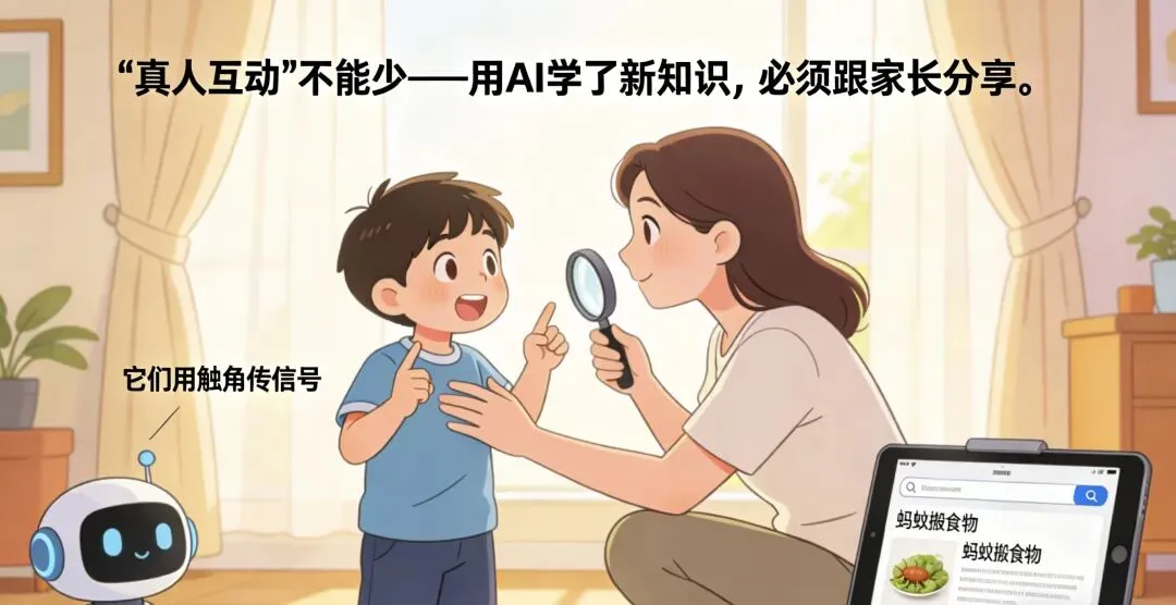 那天在公园,见一个小男孩掏出平板,说“妈妈,现在是AI时间,我要查‘蚂蚁怎么搬食物’”,妈妈笑着说“查完咱们找找蚂蚁窝,看看是不是跟AI说的一样”。男孩查完就拉着妈妈蹲在草丛边,叽叽喳喳说个不停。