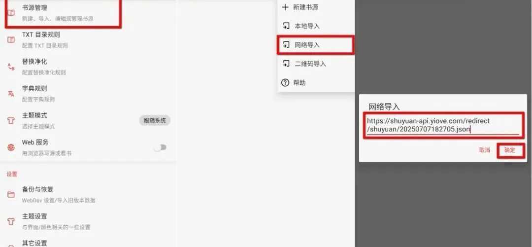 【我的】→【书源管理】→ 右上角三个点 →【网络导入】→ 输入书源链接 →【确定】