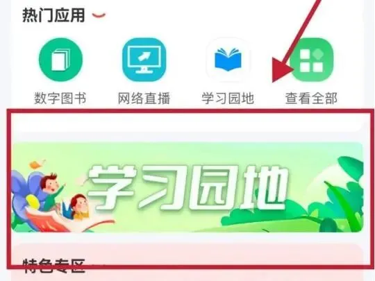 2. 在首页中间位置找到 “学习园地” 图标,点击进入即可。