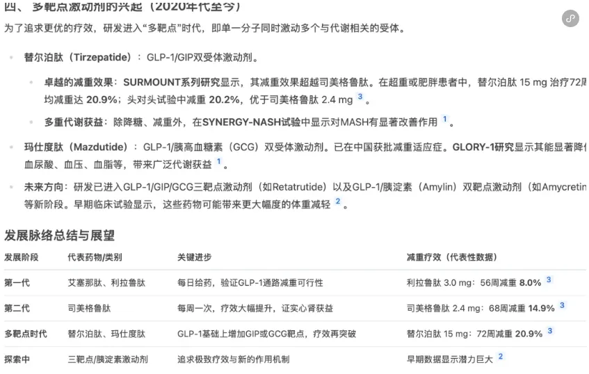 2.数据精确到小数点:“司美格鲁肽68周减重14.9%”,“替尔泊肽72周减重20.9%”。它直接省去了你翻阅几十篇文献去核对数据的时间。