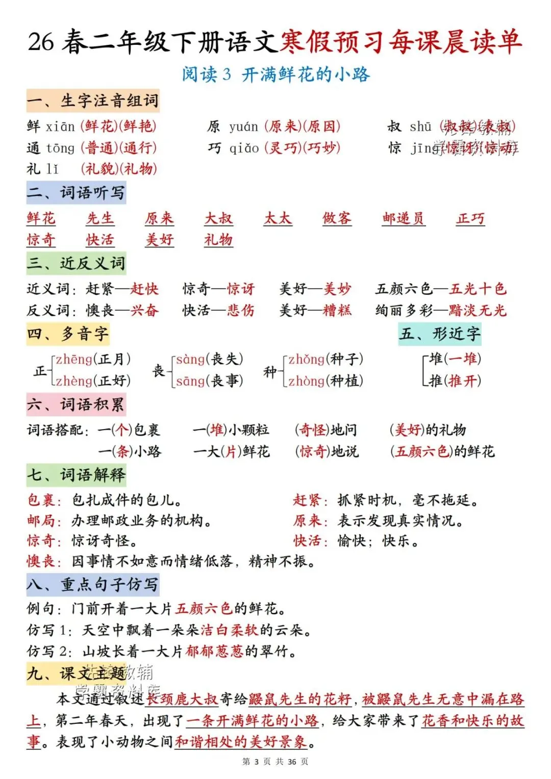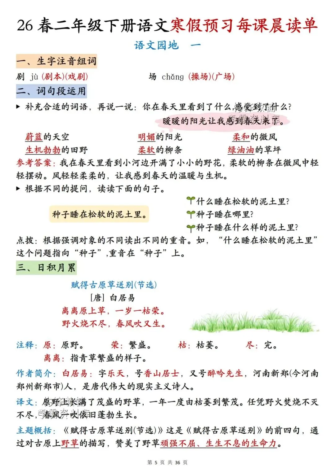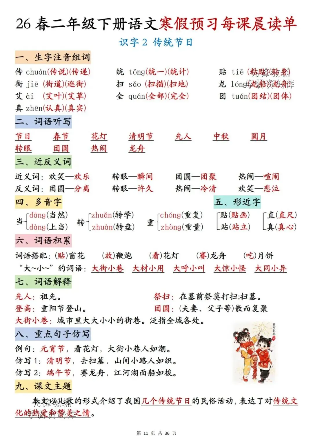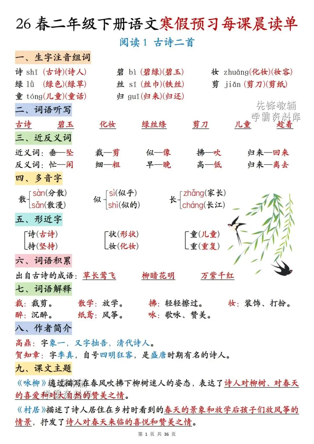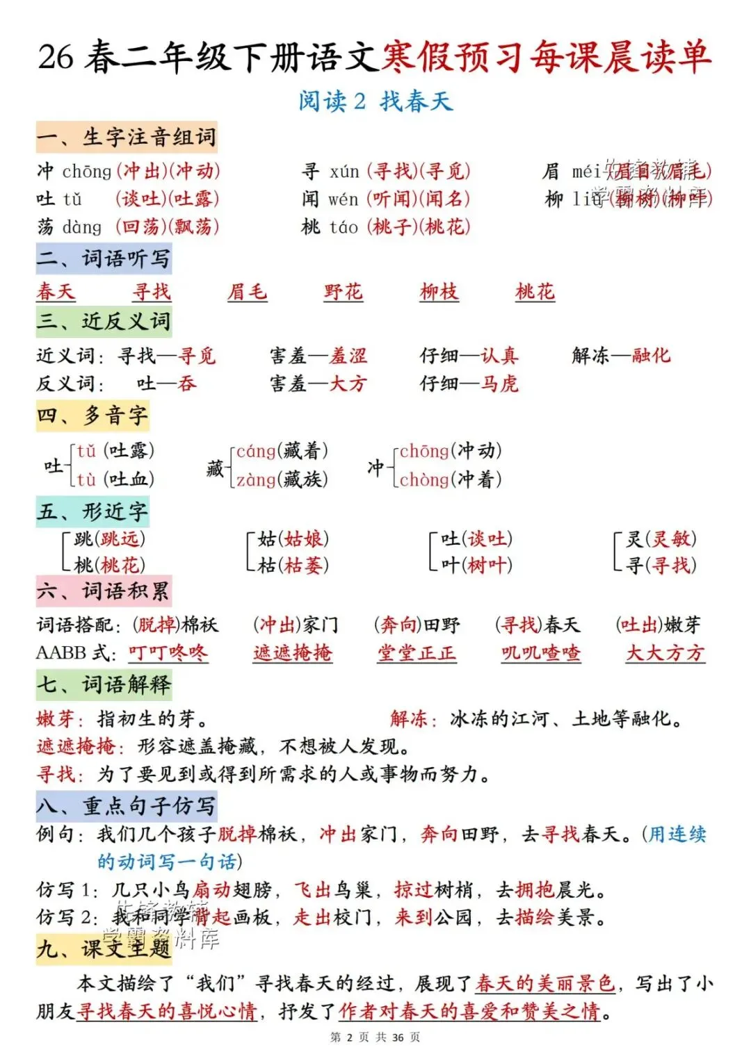 26春二年级下册语文《每课晨读单》,电子版可下载可打印。这份二下语文晨读单涵盖生字注音组词、词语听写、反义词、多音字、词语解释、课文主题等内容,通过每日晨读帮助孩子系统梳理本学期重点知识,扎实打好课内语文基础,家长们快给孩子安排上,让孩子读一读,练一练吧。
