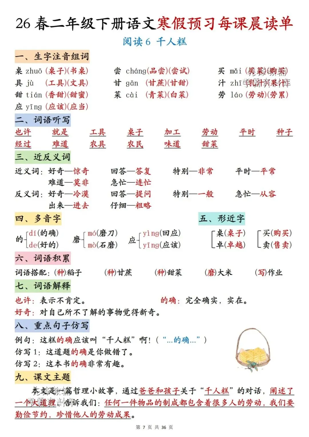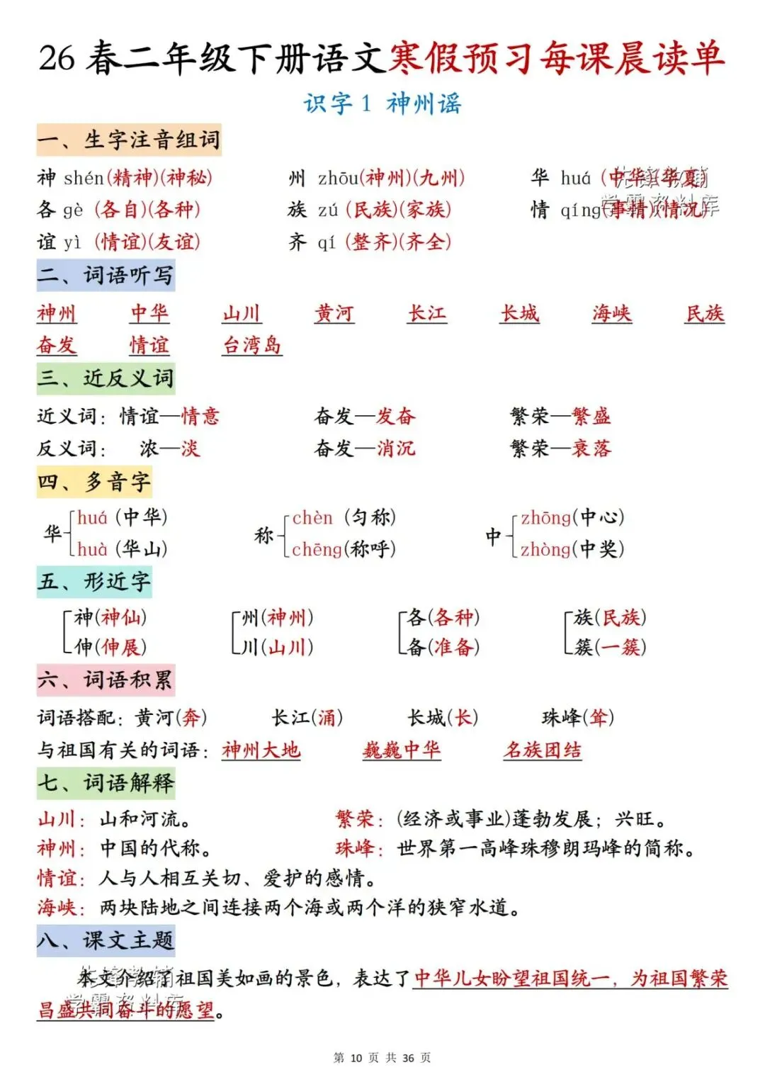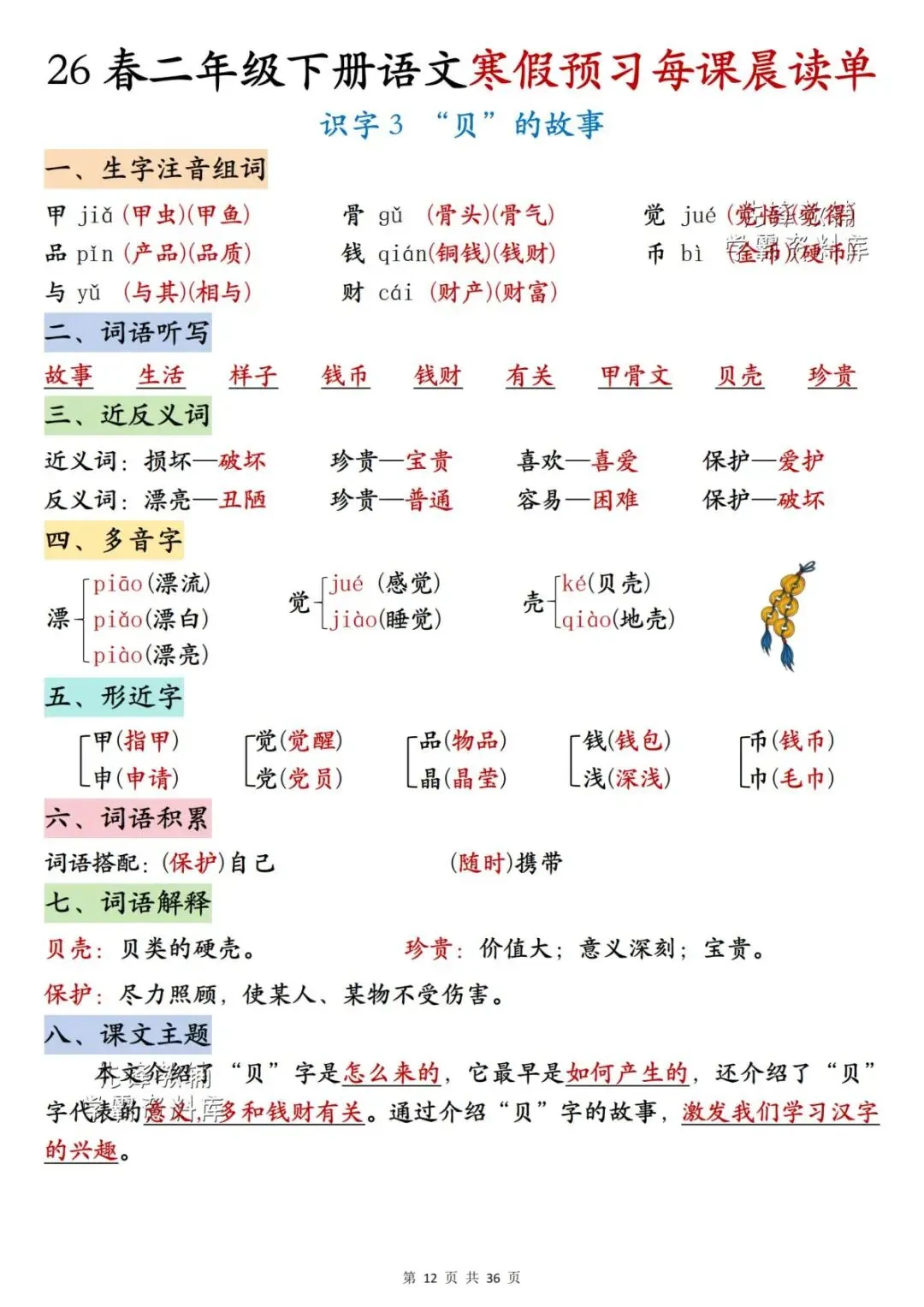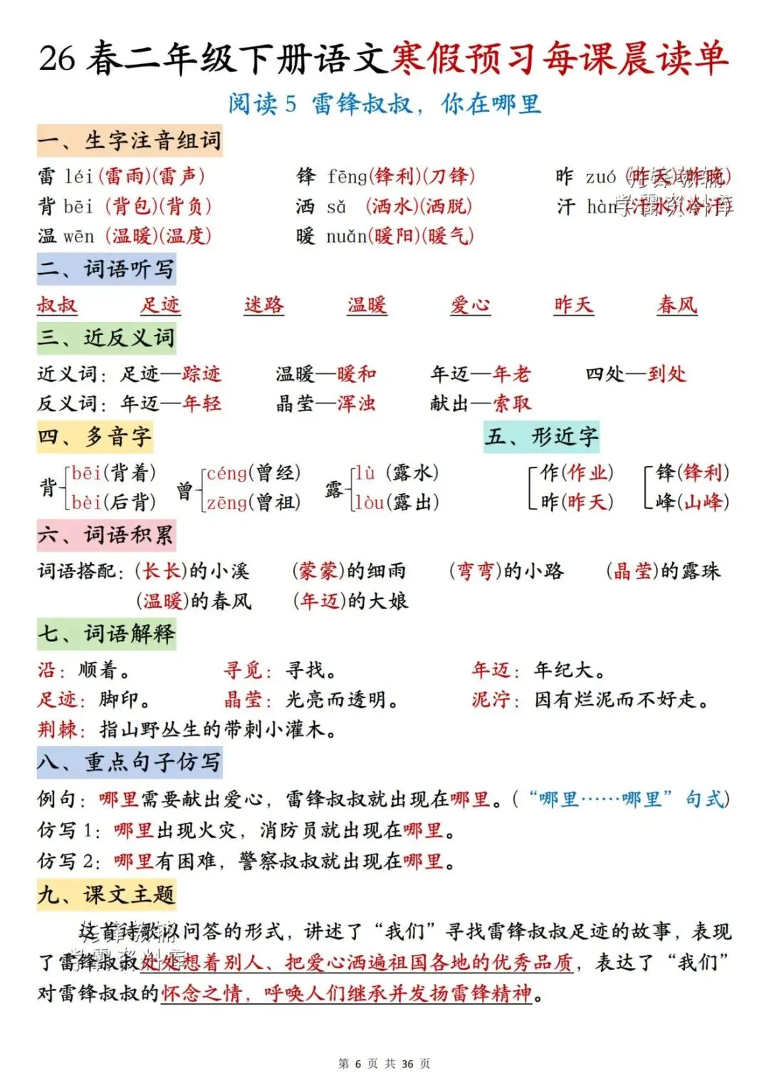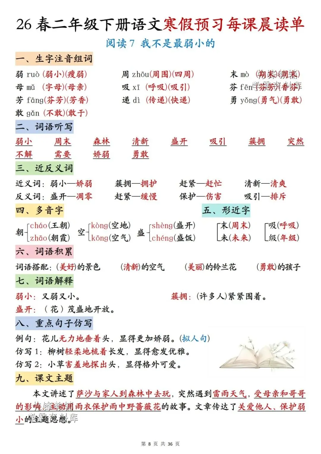 26春二年级下册语文《每课晨读单》,电子版可下载可打印。这份二下语文晨读单涵盖生字注音组词、词语听写、反义词、多音字、词语解释、课文主题等内容,通过每日晨读帮助孩子系统梳理本学期重点知识,扎实打好课内语文基础,家长们快给孩子安排上,让孩子读一读,练一练吧。