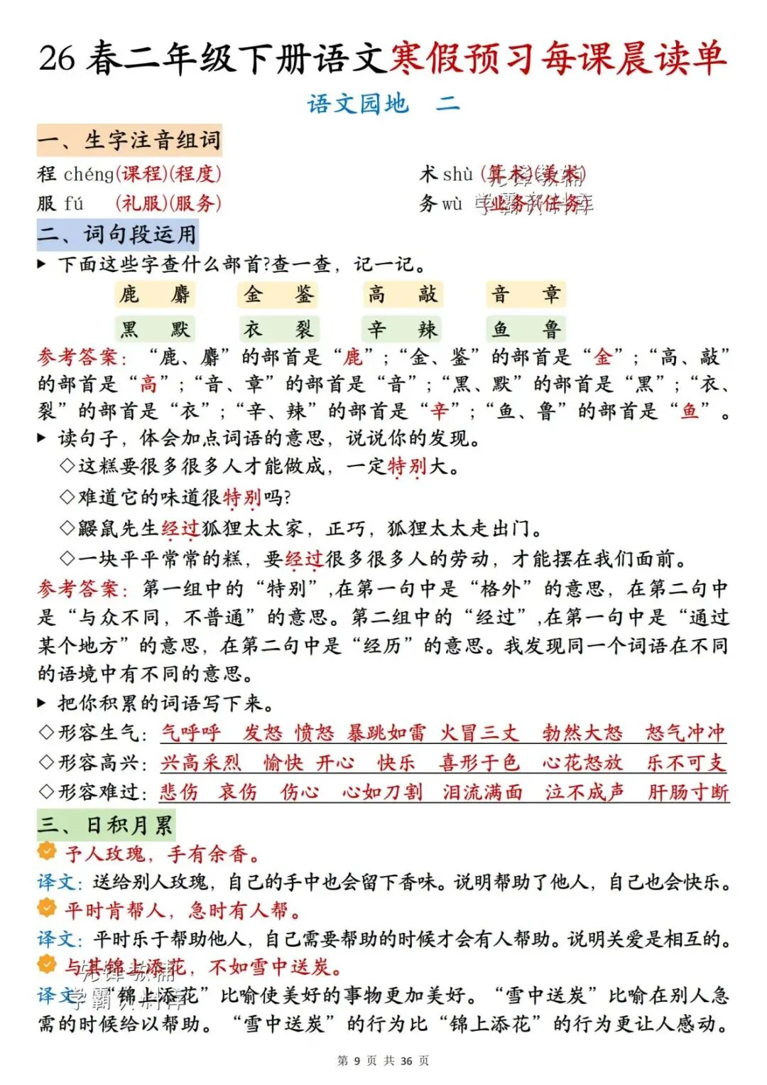 26春二年级下册语文《每课晨读单》,电子版可下载可打印