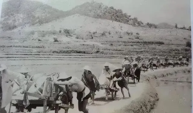 一溜人排在田埂上推着独轮车来回跑