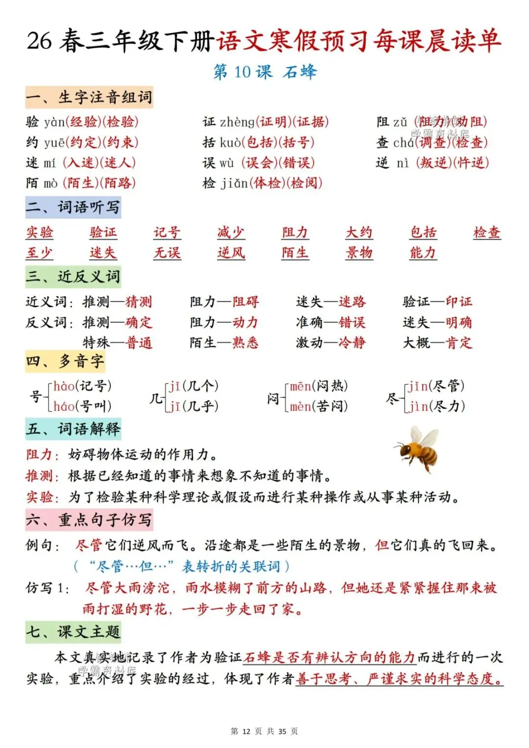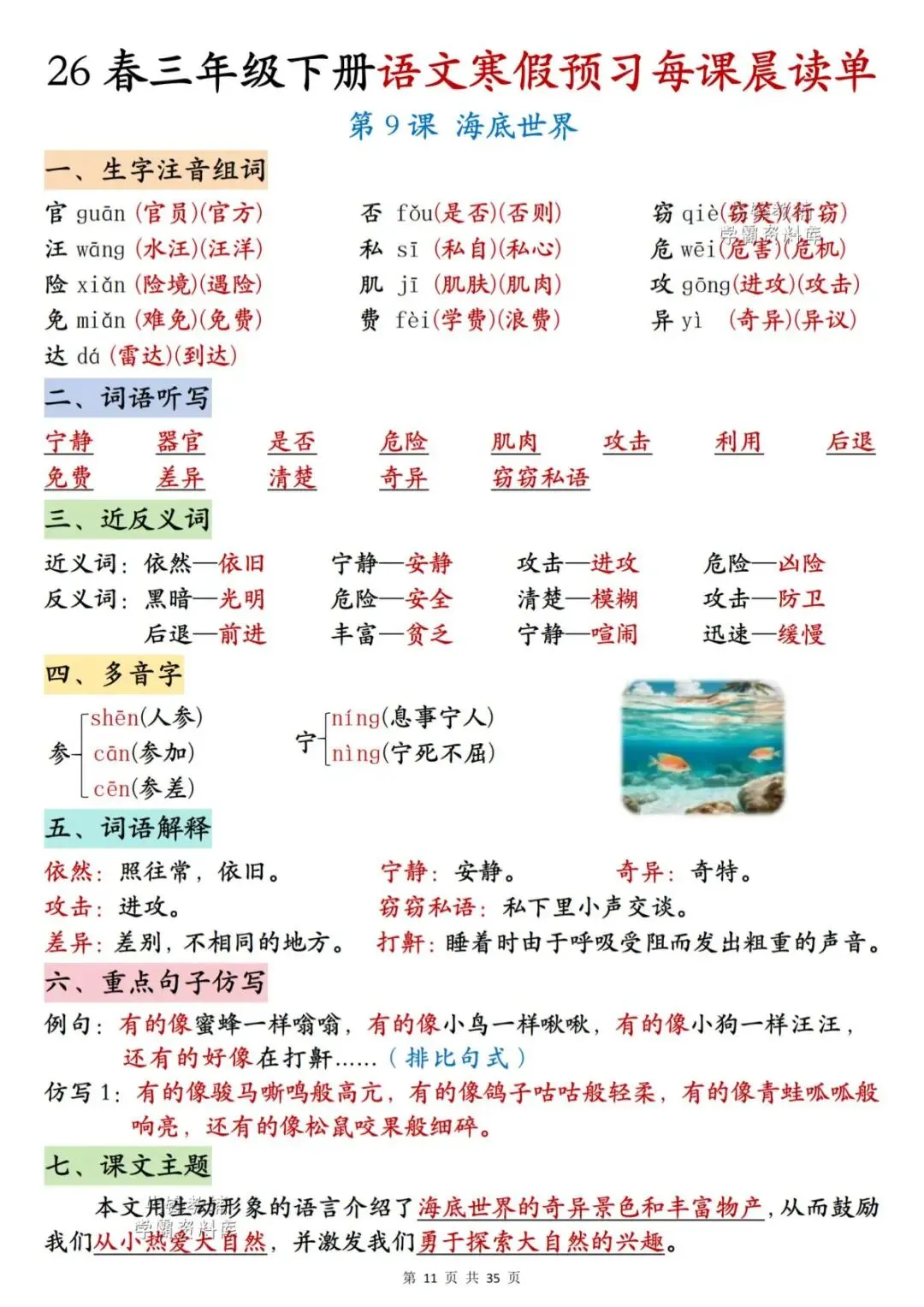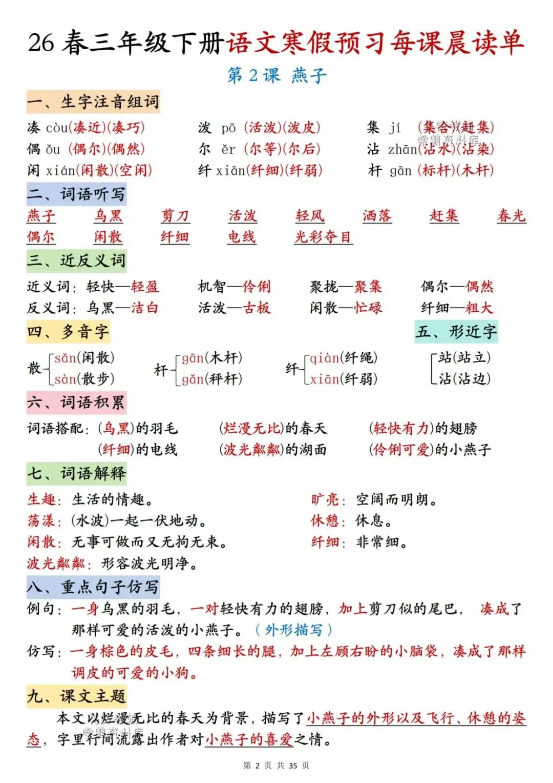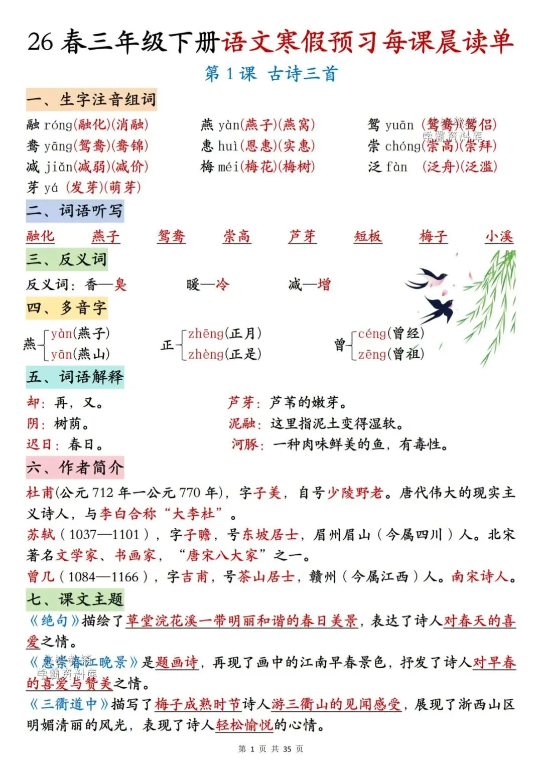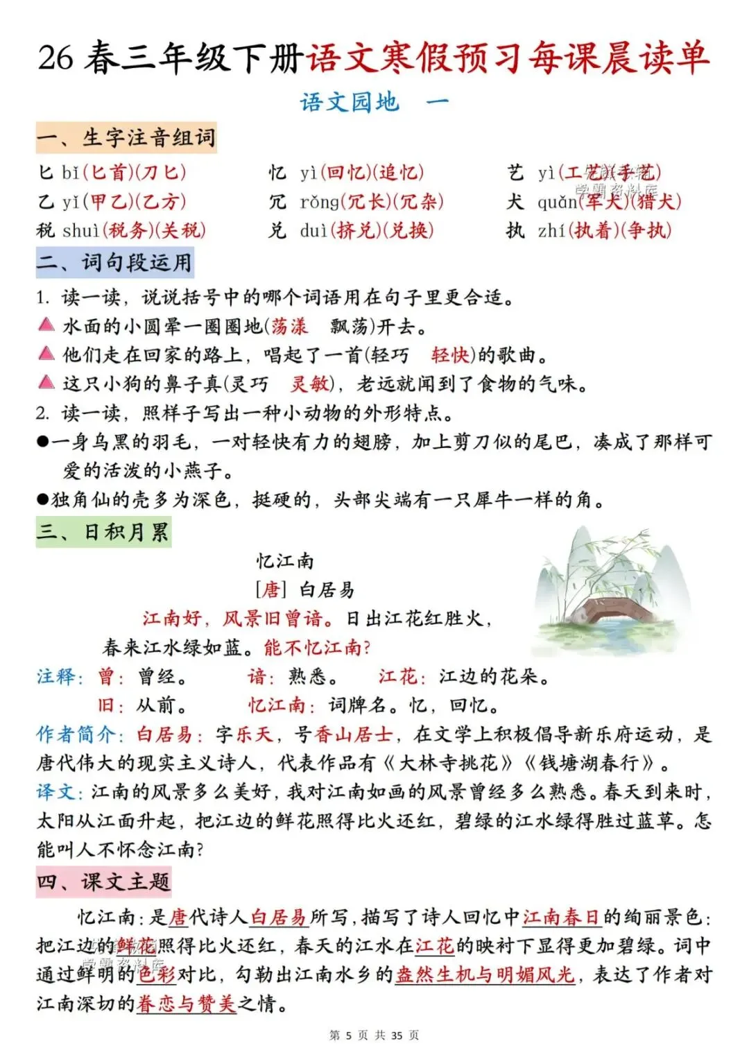 26春三年级下册语文《每课晨读单》,电子版可下载可打印。这份三下语文晨读单涵盖生字注音组词、词语听写、反义词、多音字、词语解释、课文主题等内容,通过每日晨读帮助孩子系统梳理本学期重点知识,扎实打好课内语文基础,家长们快给孩子安排上,让孩子读一读,练一练吧。