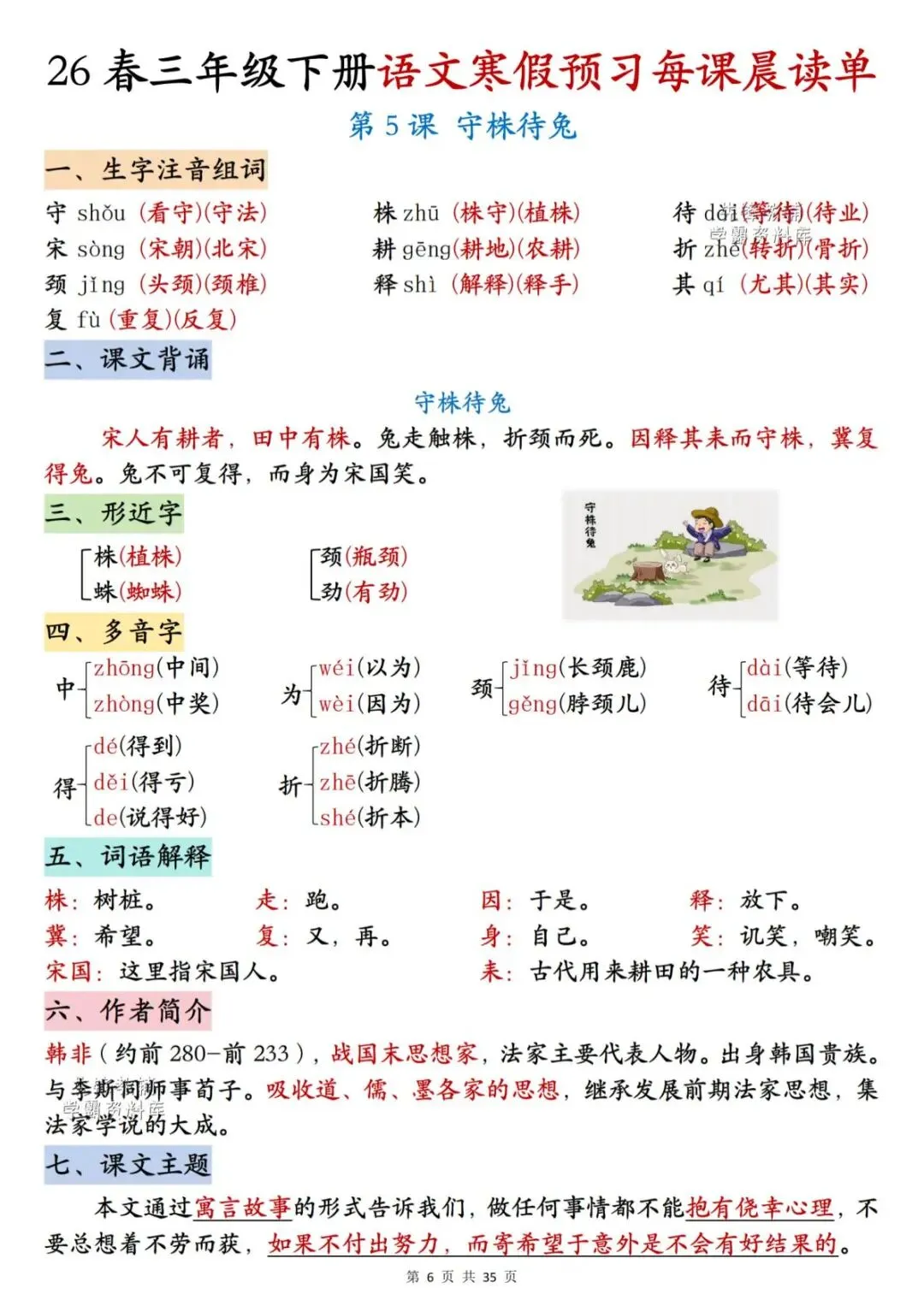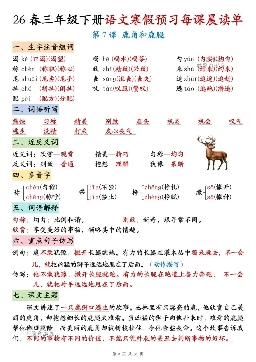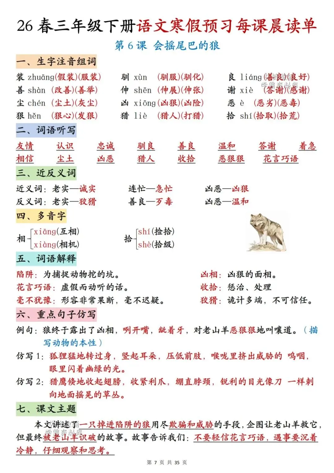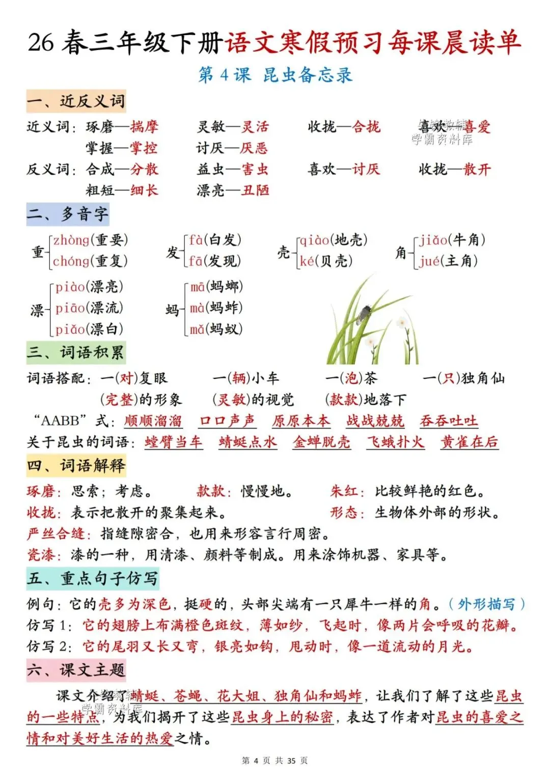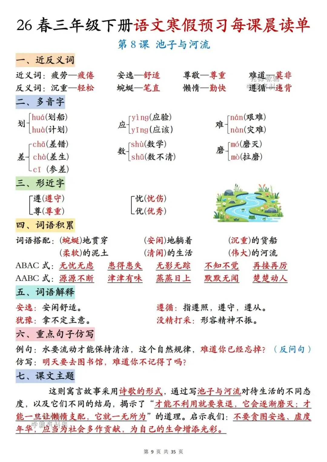 26春三年级下册语文《每课晨读单》,电子版可下载可打印。这份三下语文晨读单涵盖生字注音组词、词语听写、反义词、多音字、词语解释、课文主题等内容,通过每日晨读帮助孩子系统梳理本学期重点知识,扎实打好课内语文基础,家长们快给孩子安排上,让孩子读一读,练一练吧。